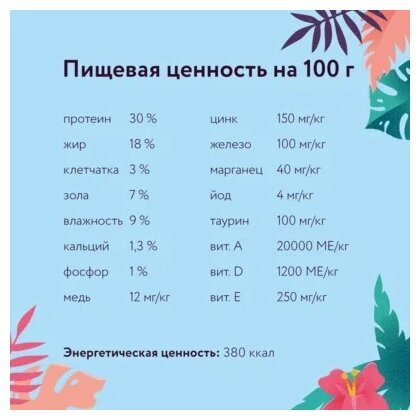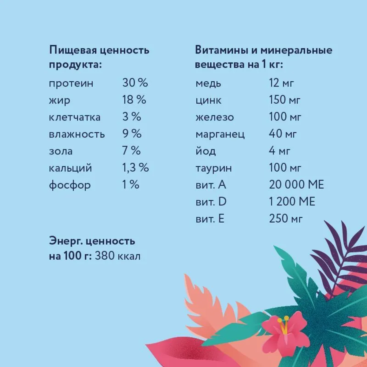 Дегидрированное мясо курицы 28%, рис, маис, куриный жир, гидролизованная куриная печень 5%, отруби, масло лососевых пород, минеральные вещества,