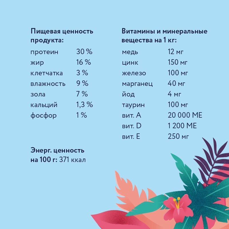 пивные дрожжи, сушёное яблоко, сушёная морковь, семя льна, сушёная мякоть свёклы, витамины, ламинария, сушёная ромашка, сушеная черника, глюкозамин,