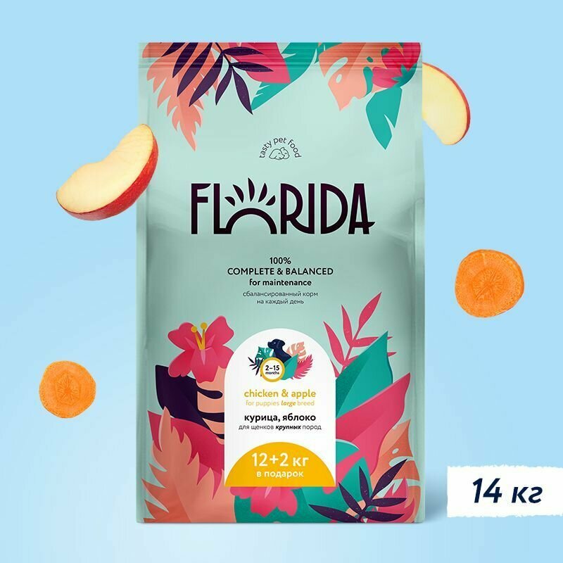Florida сухой корм для для щенков крупных пород (Курица и яблоко 12 + 2 кг.)