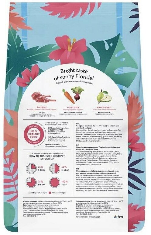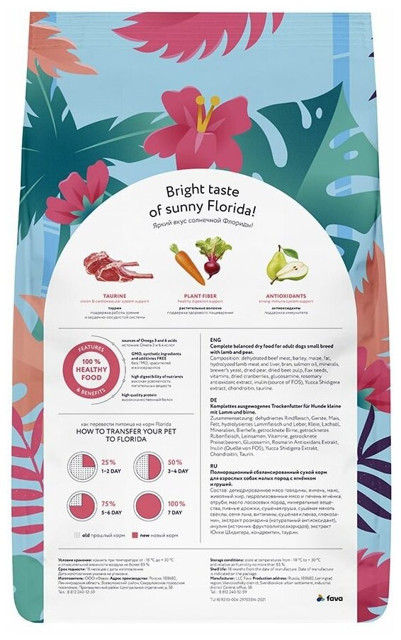 Florida Lamb and Pear - сухой корм супер-премиум-класса с ягнёнком и грушей для собак малых пород. Сбалансированное полнорационное питание, способствующее правильному развитию собаки. В рационе кормов Florida используется только белок животного происхождения.
