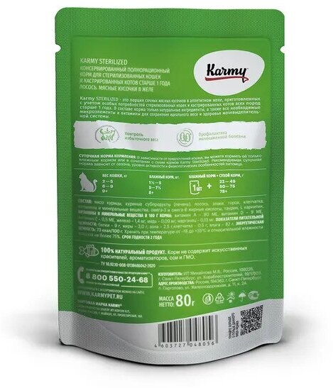 Karmy Sterilized - это порция сочных мясных кусочков в аппетитном желе, приготовленных с учетом особых потребностей стерилизованных кошек и кастрированных котов всех пород старше 1 года. В составе корма только натуральные ингредиенты, а также все необходимые микроэлементы и витамины для сохранения идеального веса и здоровья мочевыделительной системы.Ключевые особенности корма Karmy SterilizedКонтроль избыточного весаПри соблюдении норм кормления корм помогает снизить риск появления избыточного веса за счет умеренного содержания жиров.Профилактика мочекаменной болезниПри употреблении корма помогает снизить риск развития заболеваний мочевыделительной системы.Состав Мясо курицы, куриные субпродукты (печень), лосось, злаки, горох, клетчатка, витамины и минеральные вещества, Омега-3 и Омега-6 жирные кислоты, таурин, L-карнитин. Пищевая ценность на 100 г Белки - 9 г, жиры - 3,0 г, зола - 2,5 г, клетчатка - 0,5 г, влажность - 82 г. Витамины и минералы Витамин А - 90 МЕ, витамин D - 9 МЕ, витамин Е - 0,5 МЕ, железо - 1,4 мг, медь - 0,09 мг, марганец - 0,13 мг. Энергетическая ценность 73 ккал/100г Нормы кормления В зависимости от предпочтений кошки, вы можете кормить её только влажным кормом или в сочетании с сухим кормом Karmy Sterilized. Рекомендуемая суточная норма зависит от сезона, уровня активности и физиологических особенностей питомца.