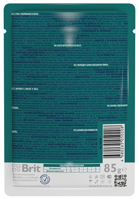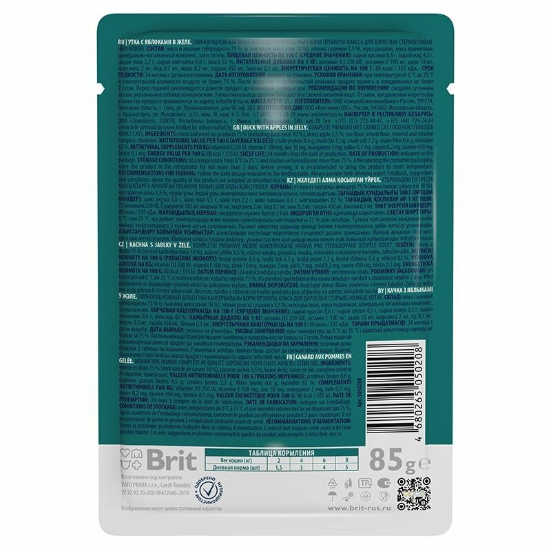 Модель: Корм влажный Brit Premium утка с яблоками в желе для взрослых стерилизованных кошек 85 г