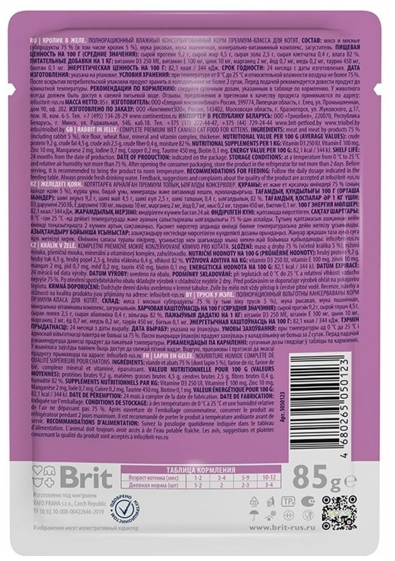 Модель: Корм влажный Brit Premium кролик в желе для котят 85 г