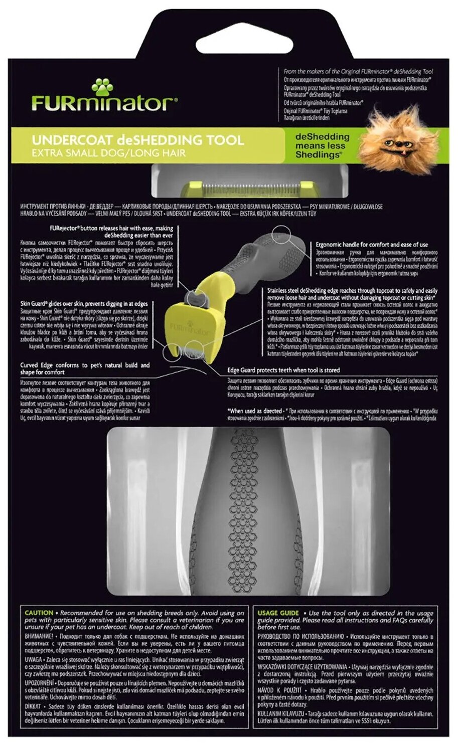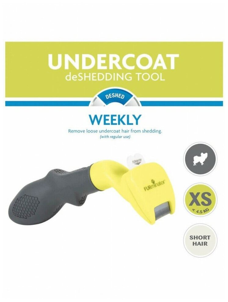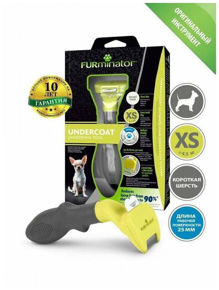 Инструмент FURminator (Фурминатор) XS 25мм (длина рабочей поверхности).Отлично подойдет для карликовых собак с длинной шерстью. Уникальное лезвие захватывает и вытаскивает мертвые волоски подшерстка до их выпадения, сокращая линьку до 90%. Инструмент экономит ваше время, сохраняет здоровье кожи и шерсти, не повреждает остевой волос. Вы забудете о выпавшей шерсти на полу, одежде и мебели. Кнопка самоочистки легко сбрасывает шерсть с инструмента. Защелкните ее для защиты в процессе хранения. Защитные края предупреждают давление на кожу. Инструкция: Вычёсывайте животное, проводя инструментом по направлению роста волос, проникая лезвием вглубь шерсти животного. Не задерживайтесь надолго в одной области. Удалите шерсть с инструмента путём нажатия на кнопку самоочистки.