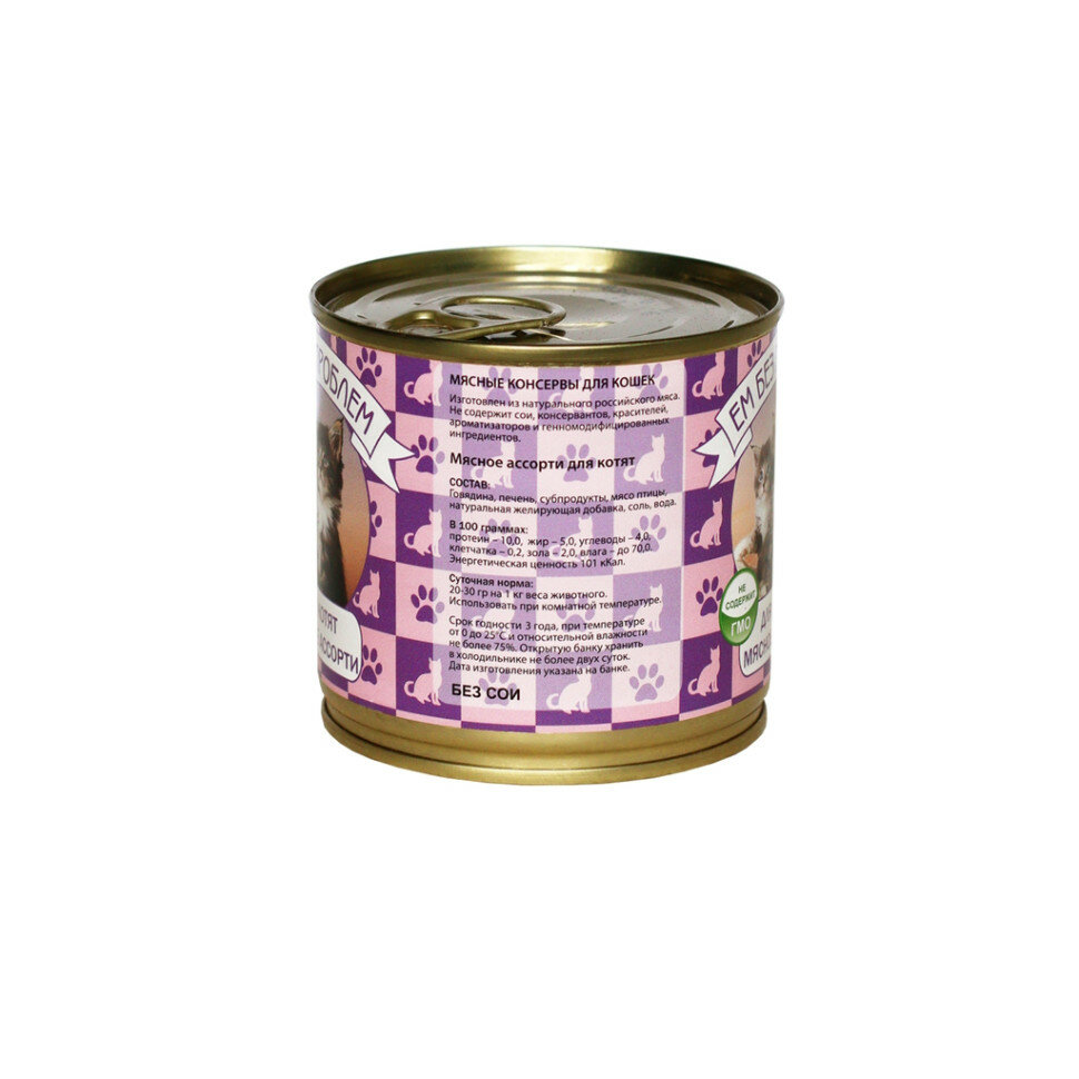 Консервы "Ем без проблем" (Россия) - это качественные корма по невысокой цене с отличными вкусовыми качествами. Все банки имеют легко вскрываемую крышку. Натуральный консервированный мясной корм Ем Без Проблем для котят. Изготовлен из натурального российского мяса. Не содержит сои, консервантов, ароматизаторов, ГМИ. Состав корма для котят Ем Без Проблем:говядина, мясо птицы, сердце, субпродукты, соль, вода.В 100г корм содержится (в граммах):протеин - 10,0Жир - 5,0углеводы - 4,0клетчатка - 0,2зола - 2,0влага - до 70,0Энергетическая ценность: 101 кКалСуточная норма кормления:20-30гр на 1кг животного. Использовать при комнатной температуре.Срок хранения 3 года со дня изготовления, при температуре от 0 до 20 градусов и относительной влажности не более 75%. Открытую банку хранить в холодильнике не более двух суток.