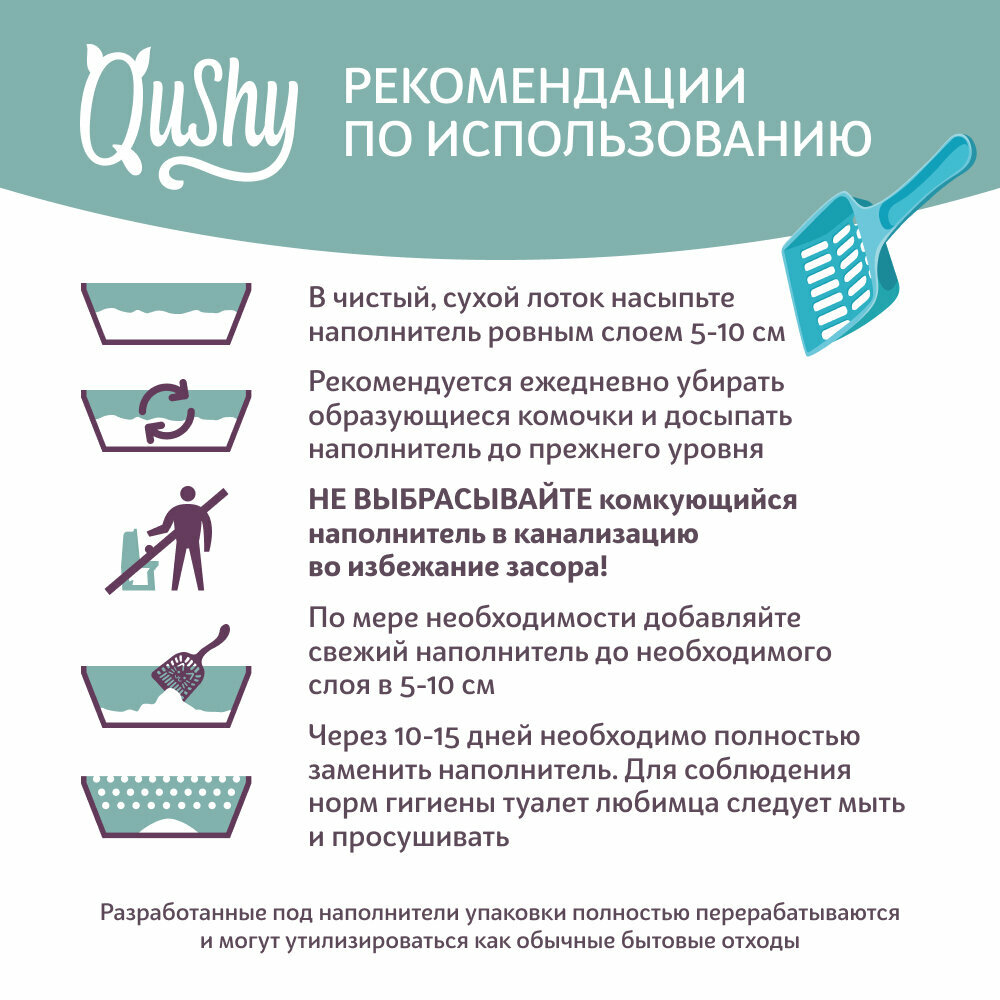 Qushy - линейка натуральных наполнителей для домашних питомцев. Изготовленные из экологически чистых материалов они уже больше года радуют многих питомцев и их хозяев. Высокая впитываемость гарантирует чистоту, сухость и отсутствие запаха.Разработанные под наполнители упаковки полностью перерабатываются и могут утилизироваться как обычные бытовые отходы.Наполнители Qushy (Куши) – это где каждый сможет подобрать, тот самый, наполнитель. В составе линейки: древесный, минеральный комкующийся, минеральный впитывающий и растительные наполнители. Минеральный комкующийся наполнитель Qushy (Куши) для кошачьих туалетов произведен из природного бентонита. Материал препятствует росту вредных микроорганизмов. Быстро впитывает влагу образуя прочный комок. Не прилипает к шерсти.Гранулы диаметром 1-5 мм.Подходит для кошек и котят.