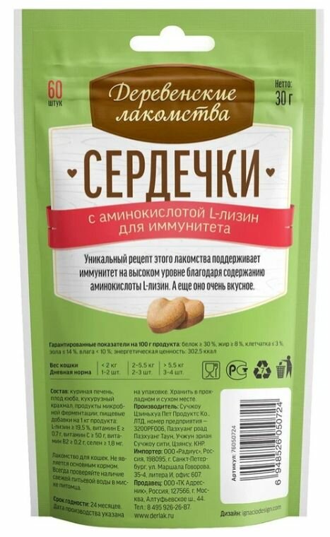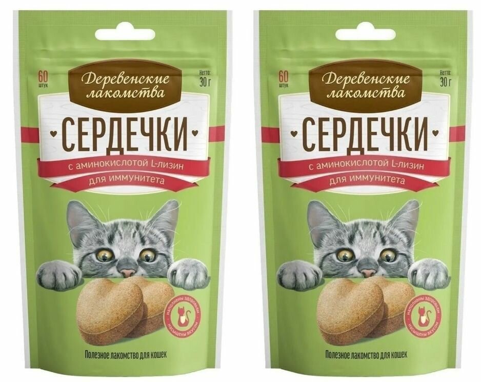 Деревенские лакомства "Сердечки с аминокислотой L-лизин для иммунитет" лакомство для кошек (30 г.)
