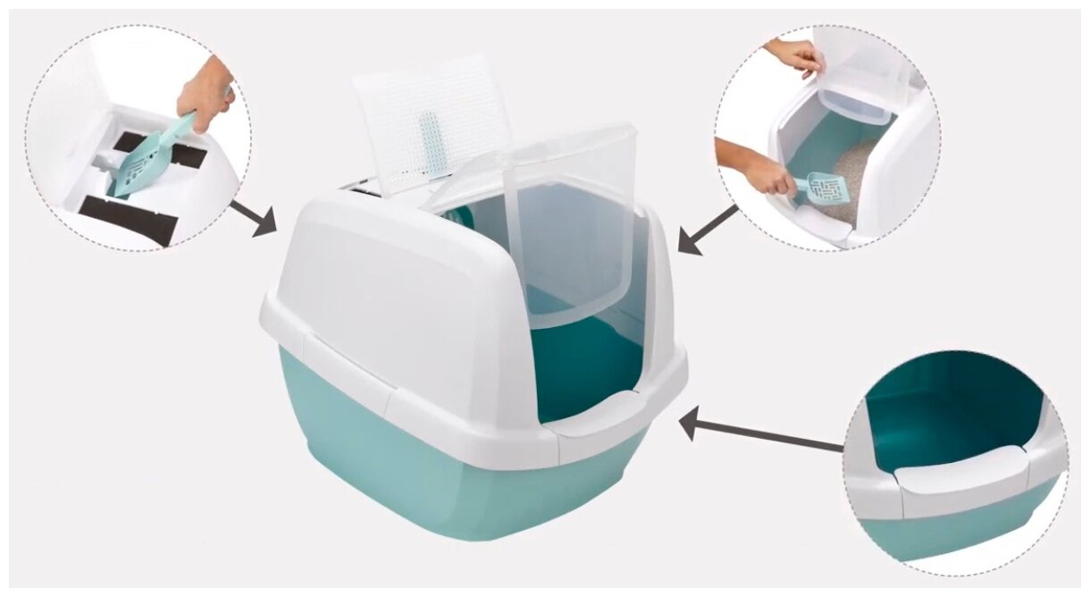 Закрытый туалет для кошек, объединивший в себе все преимущества этой категории: Фильтр из активированного угля и совок в комплекте. Фильтр улавливает нежелательные запахи и не позволяет им распространяться по квартире; Складная крышка. Складная крышка обеспечивает более легкий доступ к туалету и дополнительное удобство при чистке. На время привыкания питомца к закрытой модели туалета крышку можно сложить, а затем опустить;Идеально подходит для крупных кошек; Туалет оборудован специальной ступенькой для питомца, облегчая вход и выход;Возможность использования гигиенических пакетов; Удобная ручка для перемещения – туалет оборудован специальной ручкой на случай необходимости перенести его в другое место или переставить во время уборки;Туалет выполнен из очень качественного пластика, обладает элегантным дизайном и легко вписывается в интерьер, не нарушая его.