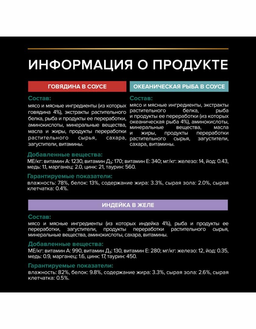 • Разнообразие вкусов и текстур: кусочки в соусе, паштет или нежное желе со вкусом говядины, курицы, индейки, утки или рыбы