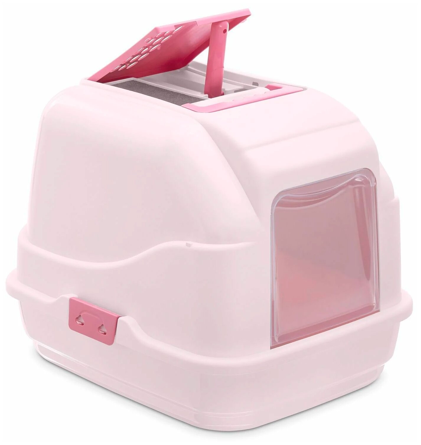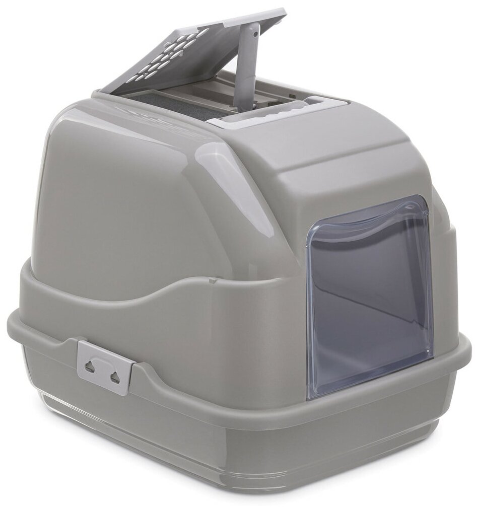 Компактный, в тоже время высокий. Пластик жесткий, не прогибается. Верхняя часть крепится по бокам с каждой стороны на одну большую защелку. Снимается очень легко и быстро. Дверку пока не прикрепила, пусть моя абиссинка попривыкнет. Наполнитель остается весь внутри лотка, лишь 1-2 крупинки на лапках попадают на пол в прихожей.