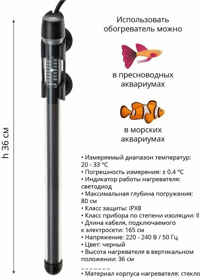 Встроенный электронный термостат позволяет регулировать температуру воды в аквариуме в диапазоне от 20 до 33 °C, обеспечивая высокую точность измерения ± 0.4 °C.