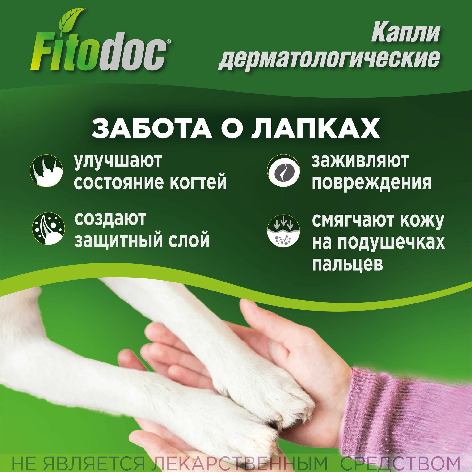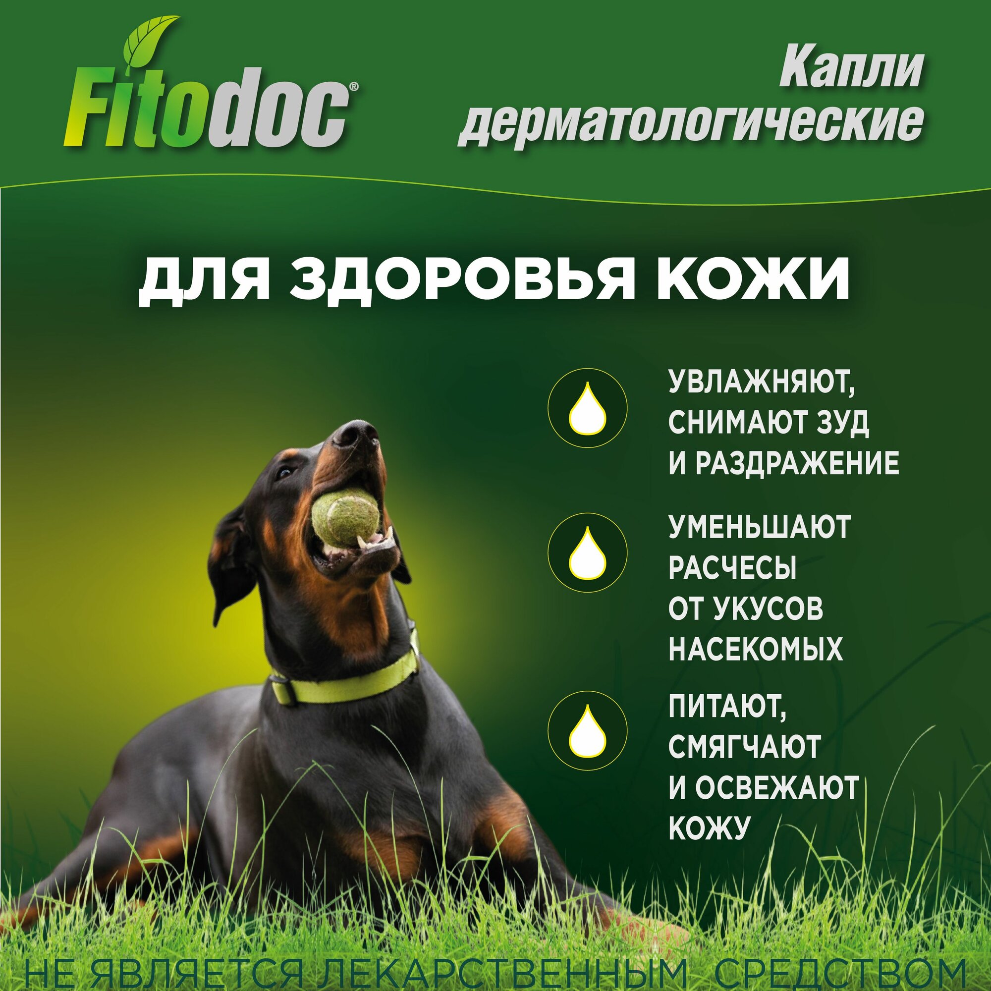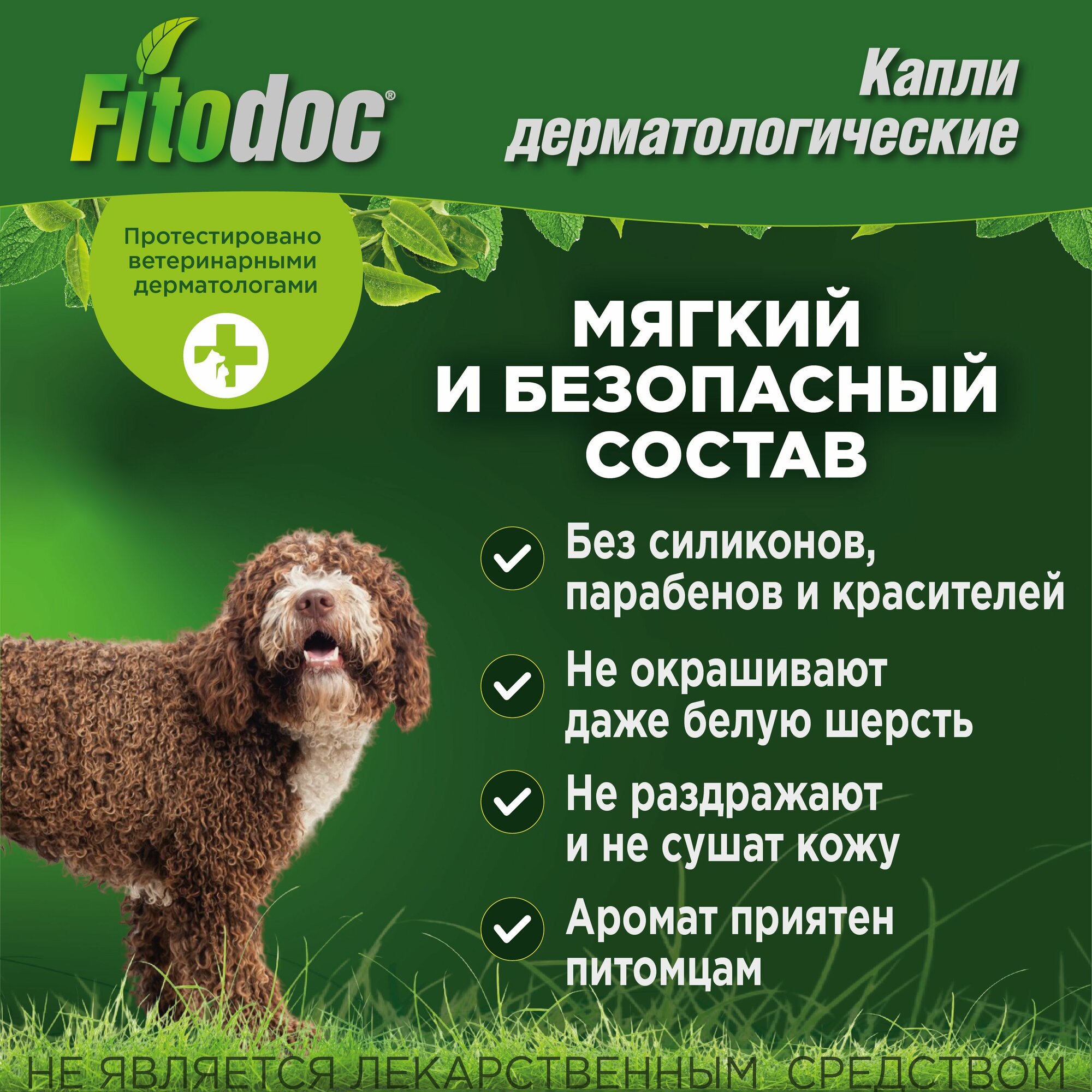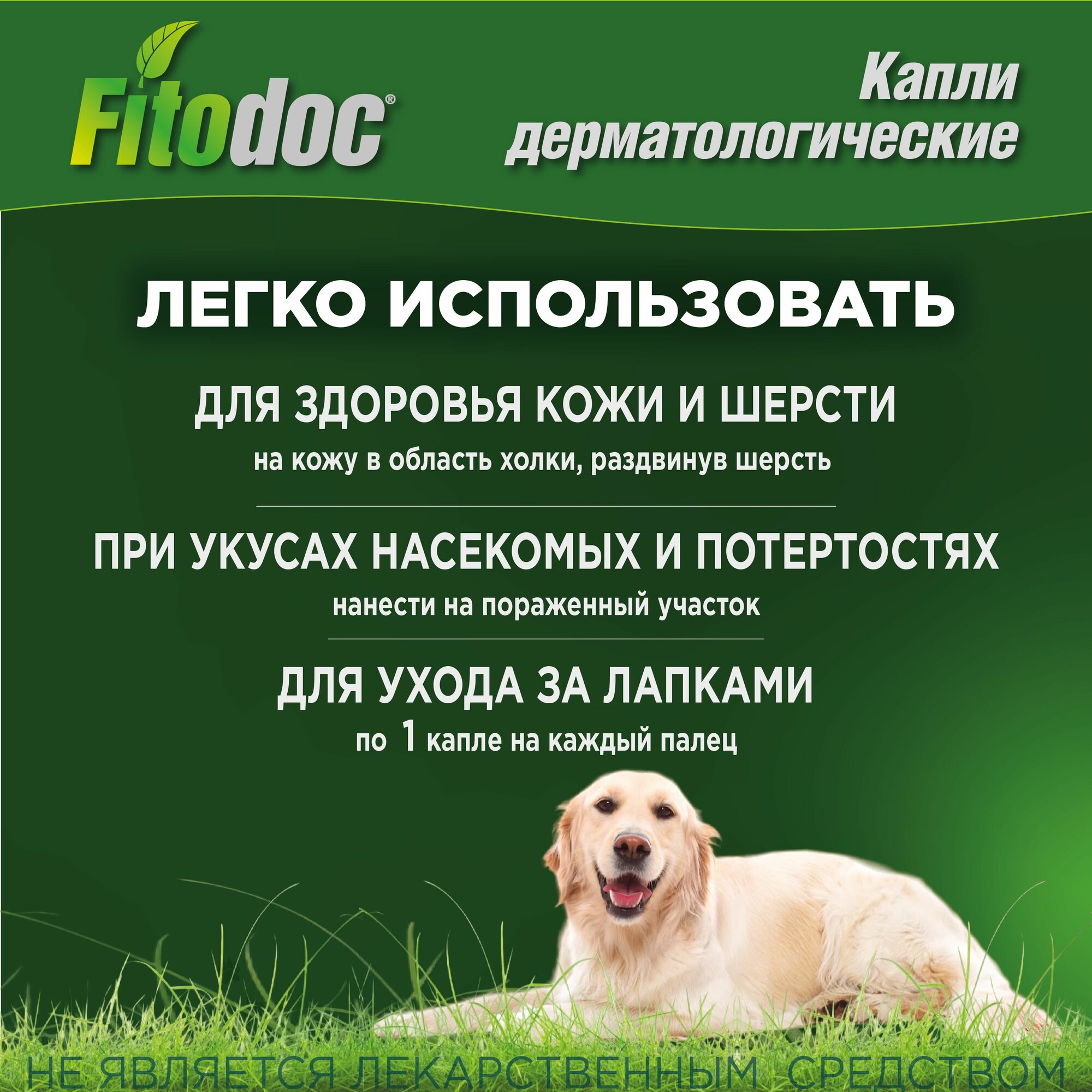 Капли дерматологические FITODOC® для собак – это зоокосметическое жидкое средство для комплексного ухода за состоянием кожно-волосяного покрова и устранения неприятного запаха. Не являются лекарственным средством! В своем составе капли содержат эфирные масла (лаванды, перечной мяты, чайного дерева, монарды и гвоздики) и косметические масла (конопляное, липы, миндальное, а также масло Ним (или маргозы), которое обладает противогрибковыми, противо-воспалительными, антибактериальными и ранозаживляющими свойствами).