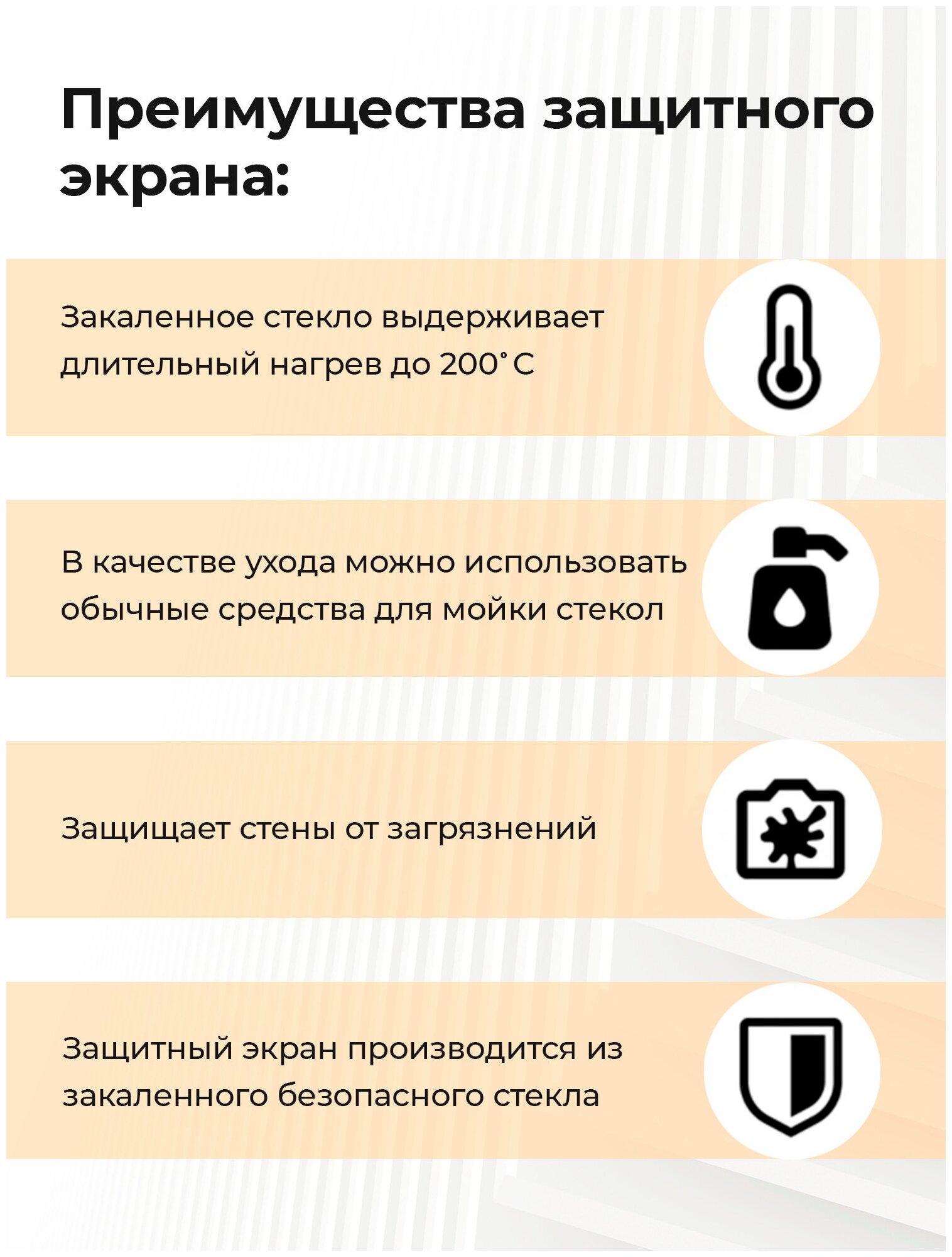 Кто же не любит вкусно поесть? Ну конечно же все! А вот отмыть брызги масла со стены после приготовления кулинарного шедевра дело не простое.Предлагаем Вам установить защитный экран из закаленного стекла, который очень легко моется и защитит стену от брызг масла и высокой температуры.Наши панели для кухни выполнены из стекла толщиной 4 мм, которое с помощью специального держателя, идущего в комплекте, устанавливается на стену возле плиты или мойки. Кухонная панель не боится нагрева до 200 градусов, обладает 100% влагостойкостью. Устойчива к агрессивным кислотным и щелочным моющим средствам.Не важно, газовая плита у вас или плита электрическая. Защитное стекло подходит ко всем типам плит. В своем производстве мы применяем только закаленное стекло, поэтому вам не придется беспокоиться о том, что оно может разбиться при транспортировке или монтаже.В нашем каталоге есть декорированные или прозрачные защитные экраны для кухни. Если вы потратились на дизайн кухни и не хотите вносить изменения в интерьер, то вам подойдет прозрачный защитный экран. Он практически не заметен, но защитит вашу стену от брызг и облегчит уборку. А для тех кто хочет внести изюминку в свой интерьер предлагаем стеклянные стеновые панели с фотопечатью.Стеклянный защитный экран - это лучшее решение для декоративной отделки стен. Легкий монтаж, займет всего 10 минут вашего времени. Для монтажа необходимо разметить и просверлить отверстия, после чего установить экран и зафиксировать декоративными заглушками.Все очень просто!Если у Вас остались вопросы, вы можете задать их, и мы ответим вам в кратчайшие сроки.