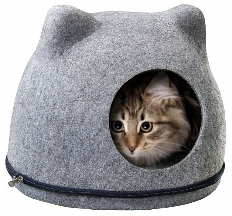 Triol Кошкин дом - оригинальный домик для кошек, который не только оживит интерьер, но и порадует вашего питомца. Изделие выполнено из войлока - натурального материала, который одновременно удерживает тепло и хорошо пропускает воздух. В нем питомцу будет тепло зимой и не жарко летом. Для дополнительного комфорта предусмотрена съемная подушка, которую можно стирать. • Материал: войлок.• Цвет домика: серый. • Цвет подушки: черный. • Размер: 340x430x340мм