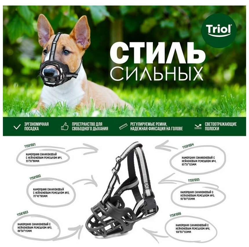 Силиконовый намордник TRIOL изготовлен из прочного, но эластичного материала, что обеспечивает эргономичную посадку по форме морды и удобство питомца. В таком наморднике собака сможет свободно дышать с приоткрытой пастью, пить воду и есть лакомства на прогулке. Дополнительное крепление намордника на голове не позволит самостоятельно снять изделие даже активной собаке. Длина ремней на шее и голове регулируется. Светоотражающие полоски на ремешках сделают прогулку в темное время суток безопаснее. Цвет изделия: черный.№ 6 -u0026nbsp; длина морды - 100мм, ширина морды - 65мм, высота морды - 155мм, обхват шеи - 420-720ммСиликоновый намордник TRIOL изготовлен из прочного, но эластичного материала, что обеспечивает эргономичную посадку по форме морды и удобство питомца. В таком наморднике собака сможет свободно дышать с приоткрытой пастью, пить воду и есть лакомства на прогулке. Дополнительное крепление намордника на голове не позволит самостоятельно снять изделие даже активной собаке. Длина ремней на шее и голове регулируется. Светоотражающие полоски на ремешках сделают прогулку в темное время суток безопаснее. u003cbr/u003eu003cbr/u003eЦвет изделия: черный. u003cbr/u003eu003cbr/u003e№ 6 -u0026nbsp; длина морды - 100мм, ширина морды - 65мм, высота морды - 155мм, обхват шеи - 420-720мм