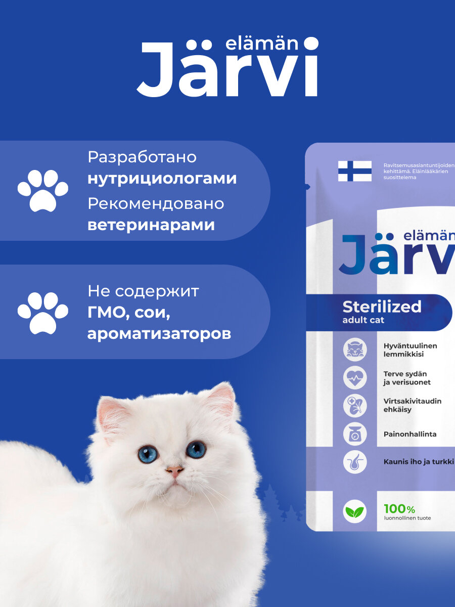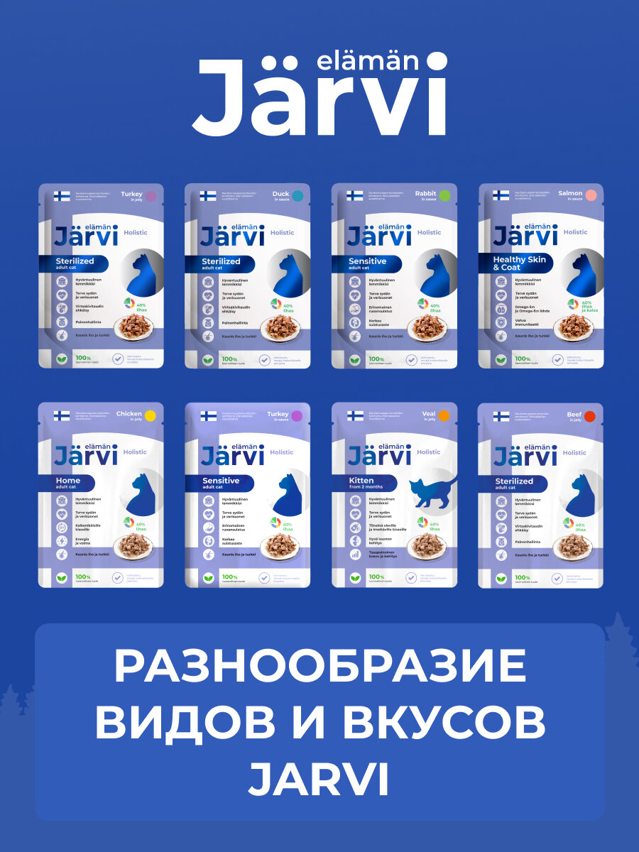 Jarvi - это полнорационный влажный корм, соответствующий высоким стандартам финского качества и производимый на российско-голландском заводе. Кастрированные коты и стерилизованные кошки нуждаются в особом рационе и заботе о здоровье мочевыделительной системы. Паучи Jarvi являются отличным выбором питания для кошек, ведь их составы разработаны с учётом потребностей всех категорий питомцев. Высокий процент мяса в составе даёт необходимую норму белка. Корм является полнорационным, а значит, обеспечивает животное всеми необходимыми веществами, витаминами и микроэлементами и не требует каких-то дополнительных добавок в питании.