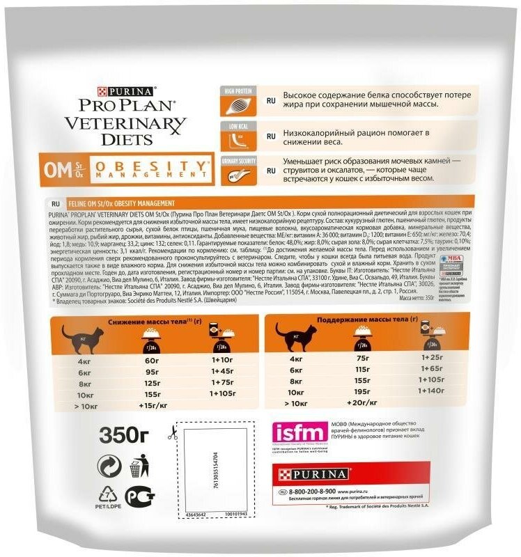 Purina Pro Plan Veterinary diets OM Корм сухой полнорационный диетический для взрослых кошек при ожирении. Корм рекомендуется для снижения избыточной массы тела, имеет низкокалорийную рецептуру.