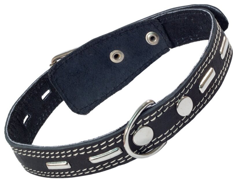 Этот ошейник - стильный кожаный аксессуар для средних и крупных собак и незаменимый помощник для их владельцев. Двойное изделие выполнено из мягкой, но прочной кожи высокого качества с использованием оригинальной металлической фурнитуры в качестве брутального декора. Предусмотренные отверстия позволяют удобно подгонять длину под индивидуальные параметры животного, а функциональное металлическое кольцо отлично подойдет для крепления карабина поводка, адресника или других аксессуаров.