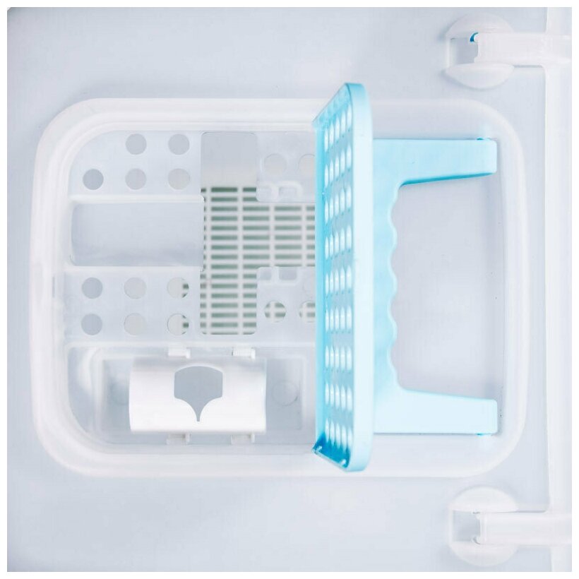 Закрытый туалет-бокс для кошек с выдвижным поддоном, совком и сеткой в комплекте. Это не просто стильный, но и функциональный аксессуар для владельцев пушистых питомцев. Такой туалет прекрасно удерживает запах благодаря сменному угольному фильтру, а закрывающаяся дверца предотвращает рассыпание наполнителя за пределы лотка. Дополнительные преимущества: - выдвижной лоток, благодаря которому отпадет необходимость разбирать всю конструкцию для уборки - сетчатая площадка на передней части бортика помогает очищать лапки кошек от наполнителя - складная ручка для удобства переноски. Туалет изготовлен из износостойкого пластика, легко моется и не впитывает запахи. Угольный фильтр в комплекте. Цвет туалета: голубой с белым. Размер туалета: 55*40*42 см. Размер совка: 20*8,8 см.