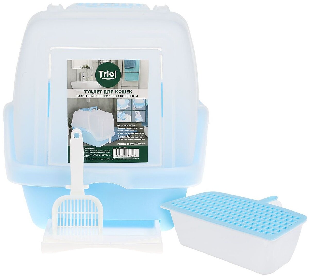 Triol P910 закрытый лоток для кошек с выдвижным поддоном с совком и сеткой (Голубой)