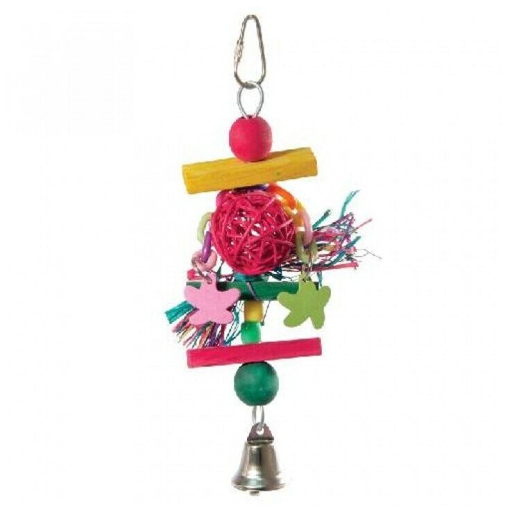 Игрушка для птиц в виде плетеного шара, цветных деревянных деталей и колокольчика. Попугай очень активная птица, ему просто необходимо обеспечить интересное времяпрепровождение, особенно в отсутствии хозяина. игрушка для попугаев привлечет внимание вашего питомца и избавит от скуки. Маленькие домашние питомцы с удовольствием будут играть и лазить, качаться на качелях, тренируя свои крылья и лапки, развивая баланс и координацию. Веселые упражнения укрепят ваши отношения и контакт с любимцами. аксессуары для клетки птицы имеют крепления - металлический карабин и легко устанавливаются в клетке. Яркая и нарядные игрушки станут украшением для клетки питомца. Поощряйте ваших домашних птиц к упражнениям и они всегда будут в хорошем настроении и отличной физической форме. Размер: d190/250мм.