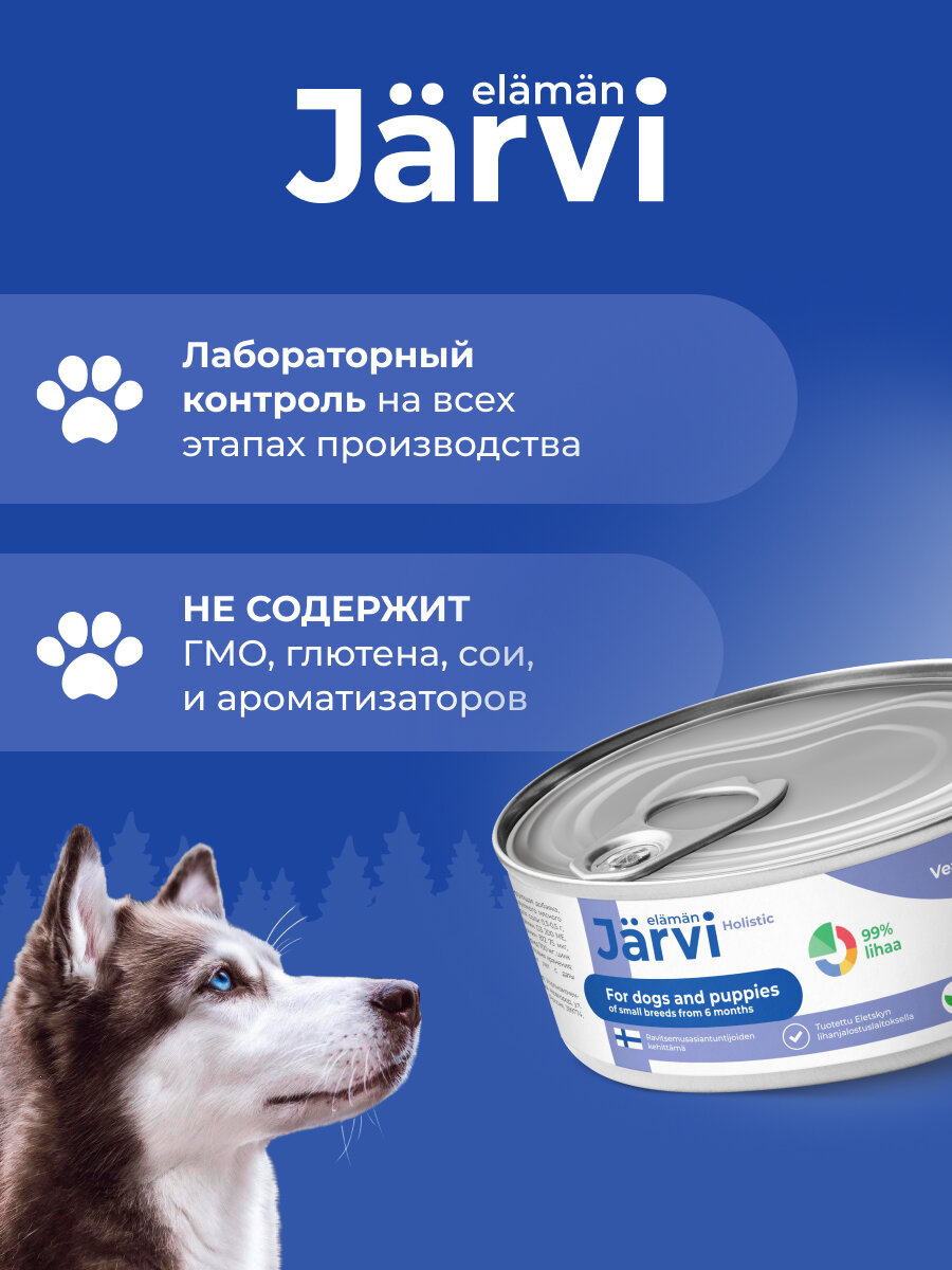 Jarvi (Ярви) - это полнорационный влажный корм, соответствующий высоким стандартам финского качества и производимый на Елецком мясокомбинате. Корм не содержит сои, ароматизаторов, ГМО. Категория используемого мясного сырья HUMAN GRADE – это значит, что в составе используются только продукты высочайшего качества, разрешённые к употреблению человеком. То есть, консервы для животных являются аналогом диетического питания человека без добавления специй, большого количества соли и усилителей вкуса. Их можно рекомендовать сторонникам натурального рациона, ведь это идеальный вариант питания для животных, не требующий готовки и подлежащий длительному хранению (при соблюдении условий хранения, указанных на этикетке). Консервы относятся к категории Holistic – содержат 99% мяса, и никакой зерновой составляющей, т. е. без глютена, а также производятся из гипоаллергенного мясного сырья. Мясо прошло необходимую термическую обработку для безопасного употребления, а правильные температуры его приготовления позволили сохранить максимум полезных качеств. Витаминно-минеральный комплекс включает: A, D3, E, C, B1, B2, B6, B12, кальция д-пантотенат, фоливую кислоту, биотин, холина хлорид, цинк, марганец, йод, медь.Консервы Jarvi (Ярви) являются отличным выбором питания для взрослых собак и щенков, ведь их составы разработаны с учётом потребностей всех категорий питомцев. Банка 100 грамм – содержит мелко рубленные волокна, поэтому рекомендуется для собак и щенков мелких пород.