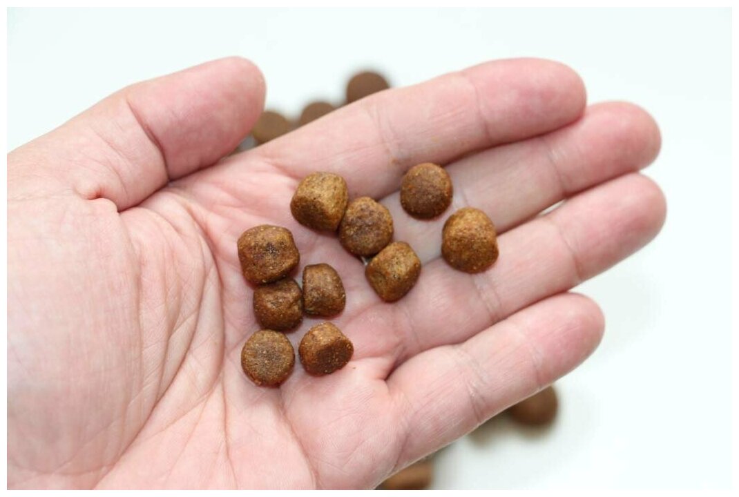 - Оптимальный размер гранул, приспособленный для поедания собаками средних пород. Препятствует чрезмерно быстрому заглатыванию корма, помогает очищать зубы.