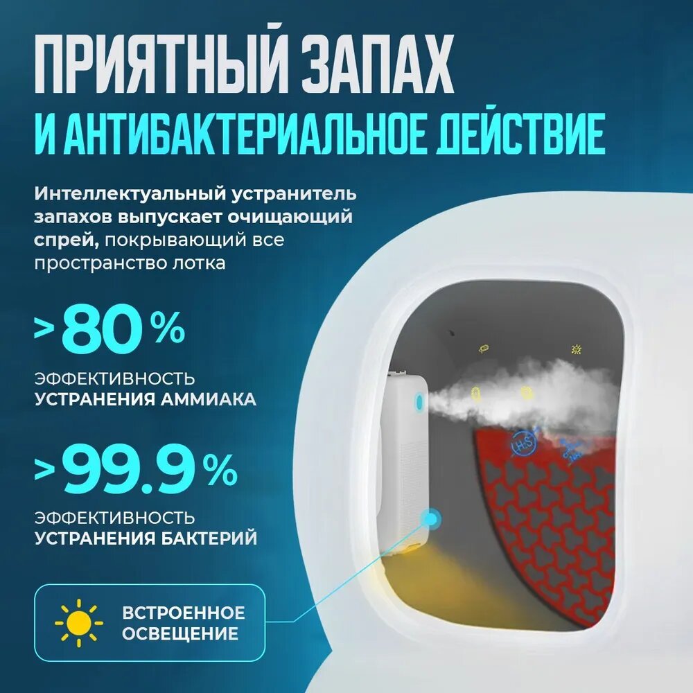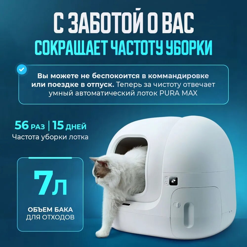 Новый автоматический лоток с функцией устранения запахов и дезодорации воздуха Petkit Pura Max. Мы обновили дизайн, сделав лоток ниже, что особенно актуально для мест с ограниченным пространством сверху. Внутренний бак стал больше в объеме (76л) и теперь свободно вмещает котиков весом до 10 кг. Лоток синхронизируется с приложением Petkit, в котором проводится основная настройка, и приходят уведомления о работе устройства. Мешок для отходов переместили в боковую часть лотка, что позволило уменьшить высоту входа в лоток на 12 см по сравнению с лотком Pura X. Высота входа в лоток Pura Max составляет всего 20 см. Мы сохранили тот же принцип работы, как и у лотка Pura X. Лоток Pura Max работает с минимальным уровнем шума, реагирует на приближение котика и нахождение его внутри лотка, строго следит за работой всех внутренних датчиков. Обратите внимание, что у лотка сверху и сбоку должно быть немного пространства, чтобы датчики свободно функционировали. Лоток не должен быть плотно прижатым к стене и иметь слишком близко приближенные объекты. Данная модель проводит уборку по другому радиусу вращения: теперь бак крутится назад на 180 градусов и затем возвращается обратно. Фильтрующая сетка находится внутри задней части бака. Автоматический лоток Pura Max подходит для котиков от 6 месяцев и весом от 1.5кг. Автоматические лотки Petkit не требуют ежедневной уборки. Достаточно менять наполнитель по мере заполнения мешка для отходов, мыть бак лотка будет достаточно 1-2 раза в месяц (при нормальном «стуле» питомца).