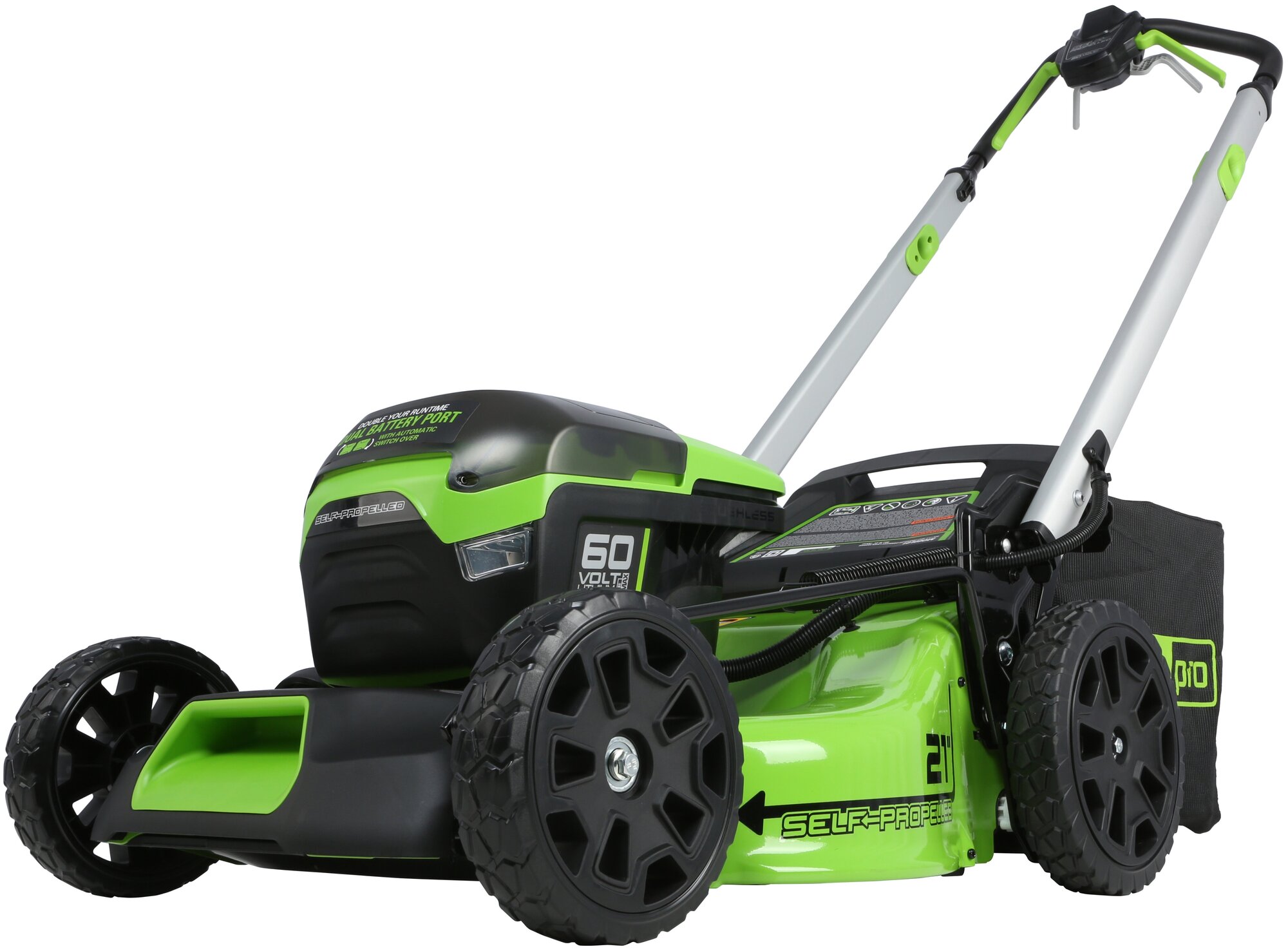 Аккумуляторная газонокосилка Greenworks - это мощная и практичная самоходная газонокосилка с приводом на задние колеса мощностью 60V. Регулируемая скорость позволяет без труда обрабатывать большие участки. Оптимально подходит для территории 1000 - 1400м². Данная модель оснащена передовым бесщеточным двигателем DigiPro. Функция мульчирования, большой травосборник и боковой выброс позволяет ухаживать за большими участками. Для запуска газонокосилки нужно зажать кнопку включения и рычаг запуска. После чего двигатель приводит в движение нож, который срезает траву. Второй рычаг предназначен для самоходного режима. По центру расположена кнопка, с помощью которой можно регулировать скорость движения от 2,5 до 4,9 км/ч. При нажатии на кнопку Turbo скорость вращения ножа увеличивается с 2800 до 3200 об/м, благодаря чему Вы можете более эффективно косить густую траву. Обращаем Ваше внимание, что использование Turbo-режима приводит к повышенному потреблению энергии аккумулятора. Газонокосилка оснащена 2-х слотовым батареепримником с функцией Switchover. Когда первый аккумулятор разряжается, вам не нужно идти за новым - произойдет автоматическое переключение на второй. Батареи в отсеках работают поочередно, установка сразу 2-х батарей не обязательна. В комплекте данной газонокосилки имеется аккумулятор линейки 60V ёмкостью 4 А/ч. Примерное время работы косилки с этой батареей составляет 40 мин.