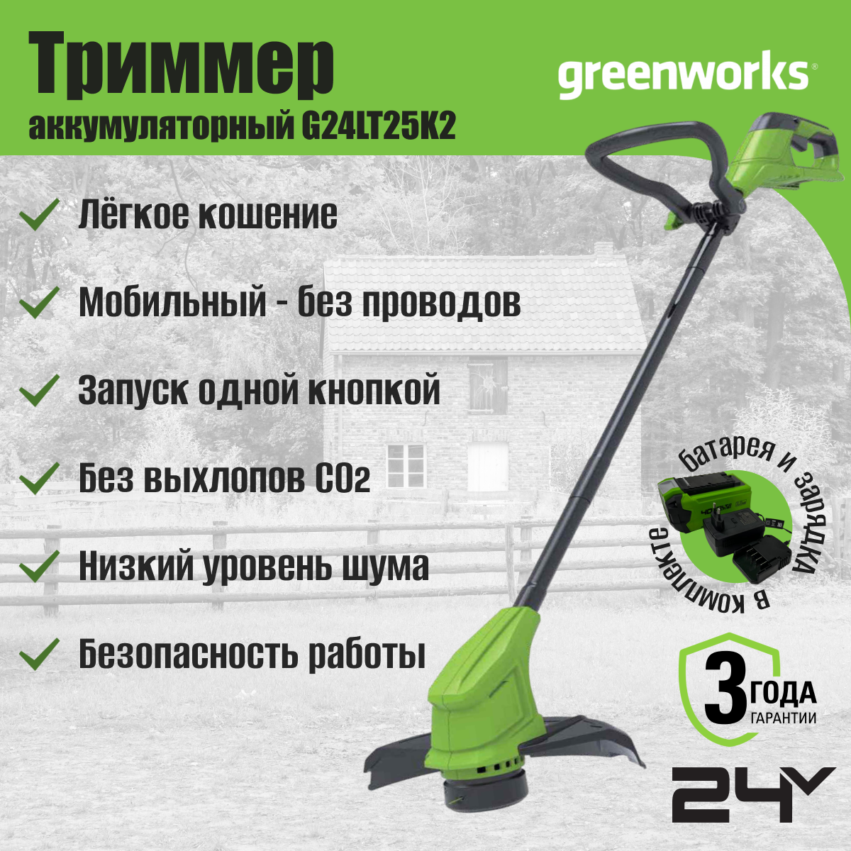 Комплект: Триммер аккумуляторный Greenworks Арт. 2107207SA, 24 V, 25 см, с АКБ 2Ач и ЗУ. Аккумуляторный триммер Greenworks, 24V - базовая модель в линейке садовых электрических триммеров Greenworks G-24. Применяется для кошения травы на небольших участках, а также там, где применение газонокосилки затруднено : узкие пространства, неровная почва. Аккумуляторный триммер - это достойная замена сетевому инструменту. Его главное преимущество - автономность, что позволяет работать в самых труднодоступных местах. Вес всего 2,2 кг, делает триммер буквально очень легким в использовании. Ширина скашивания 25 см, катушка имеет односторонний вывод лески диаметром 1,6 мм с автоподачей. Скорость вращения вала 8500 оборотов в минуту. Время автономной работы от аккумулятора 4 Ач составляет до 40 минут. Двигатель инструмента оснащен защитой от перегрузок, для защиты от случайного включения предусмотрен специальный предохранитель. Работа от Li-Ion аккумулятора 24V, совместимого с 70 инструментами для сада, дома, мастерской из линейки Greenworks 24V. Расширенная гарантия на инструмент: 3 года! Гарантийный срок на аккумулятор составляет 2 года. Особенности: аккумуляторного триммера Greenworks: Питание от аккумулятора 24V; Щеточный двигатель; Ширина скашивания 25 cм; Леска 1,6 мм; Выход лески с одной стороны; Автоматическая подача лески; Стальная штанга из 3-х элементов; Переставляемая по высоте D-образная ручка; Двигатель с защитой от перегрузок; Предохранитель от случайного включения; Дуга-ограничитель для защиты растений. Самый легкий и компактный аккумуляторный триммер Greenworks : вес всего 2,2 кг (без АКБ и ЗУ); Длина устройства (от триммерной головки до верхней части ручки): 124 см; Время автономной работы от 4 Ач до 40 минут; Состав комплекта: аккумуляторный триммер Greenworks 25 см; аккумулятор Greenworks 24V 2Aч; Зарядное Устройство Greenworks 24V 2А; Руководс тво по эксплуатаци