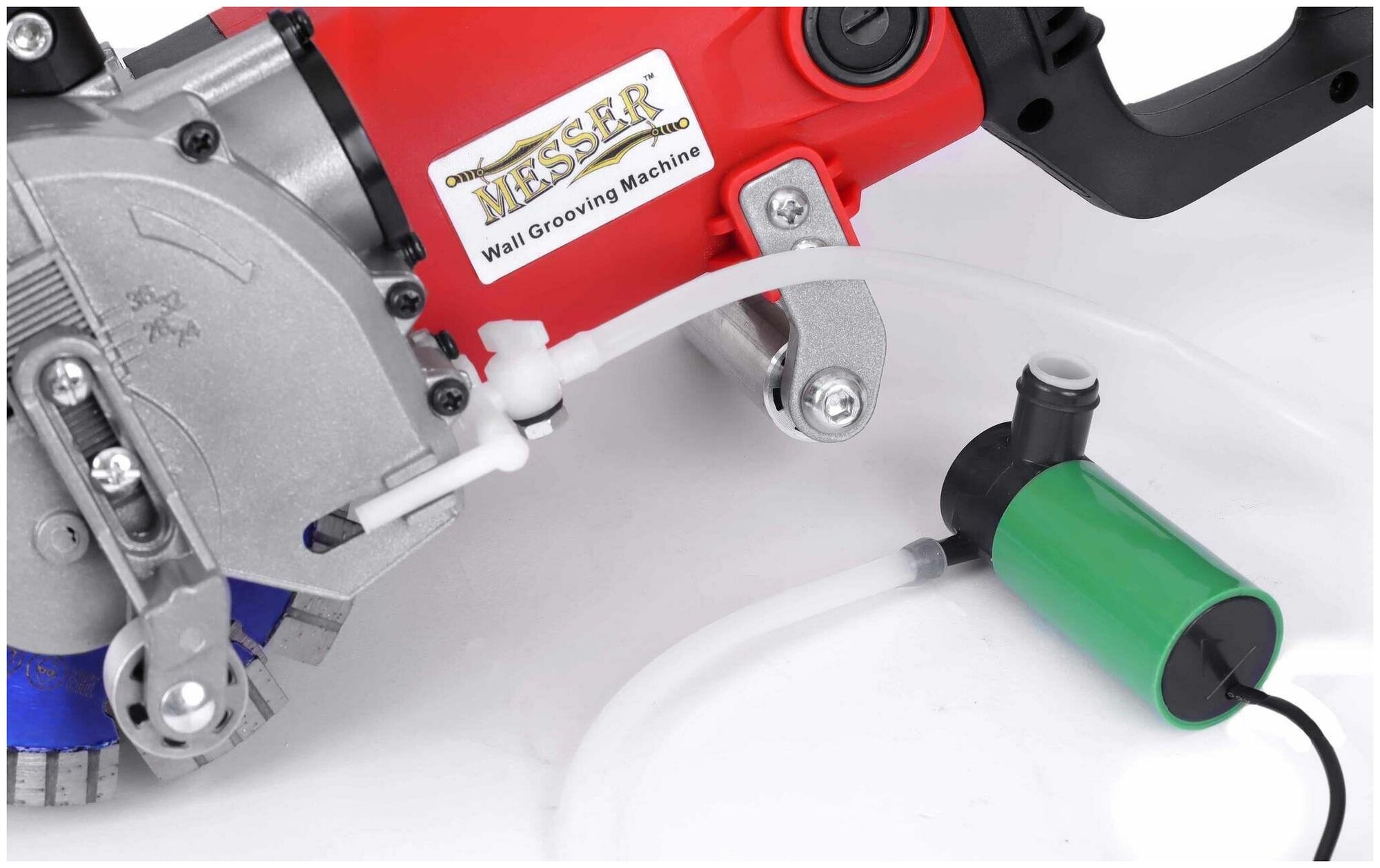 Также штроборез MESSER T1556 имеет возможность подачи воды в зону реза. Причем нет необходимости в наличии рабочего водопровода на объекте. Вода может подаваться прямо из ведра, канистры или другой емкости благодаря небольшому насосу, поставляемому в комплекте со штроборезом. Задняя рукоять, помимо органов управления, имеет механизм, позволяющий поворачивать ее на 180 градусов, что в определенных ситуациях может сильно упростить работу.