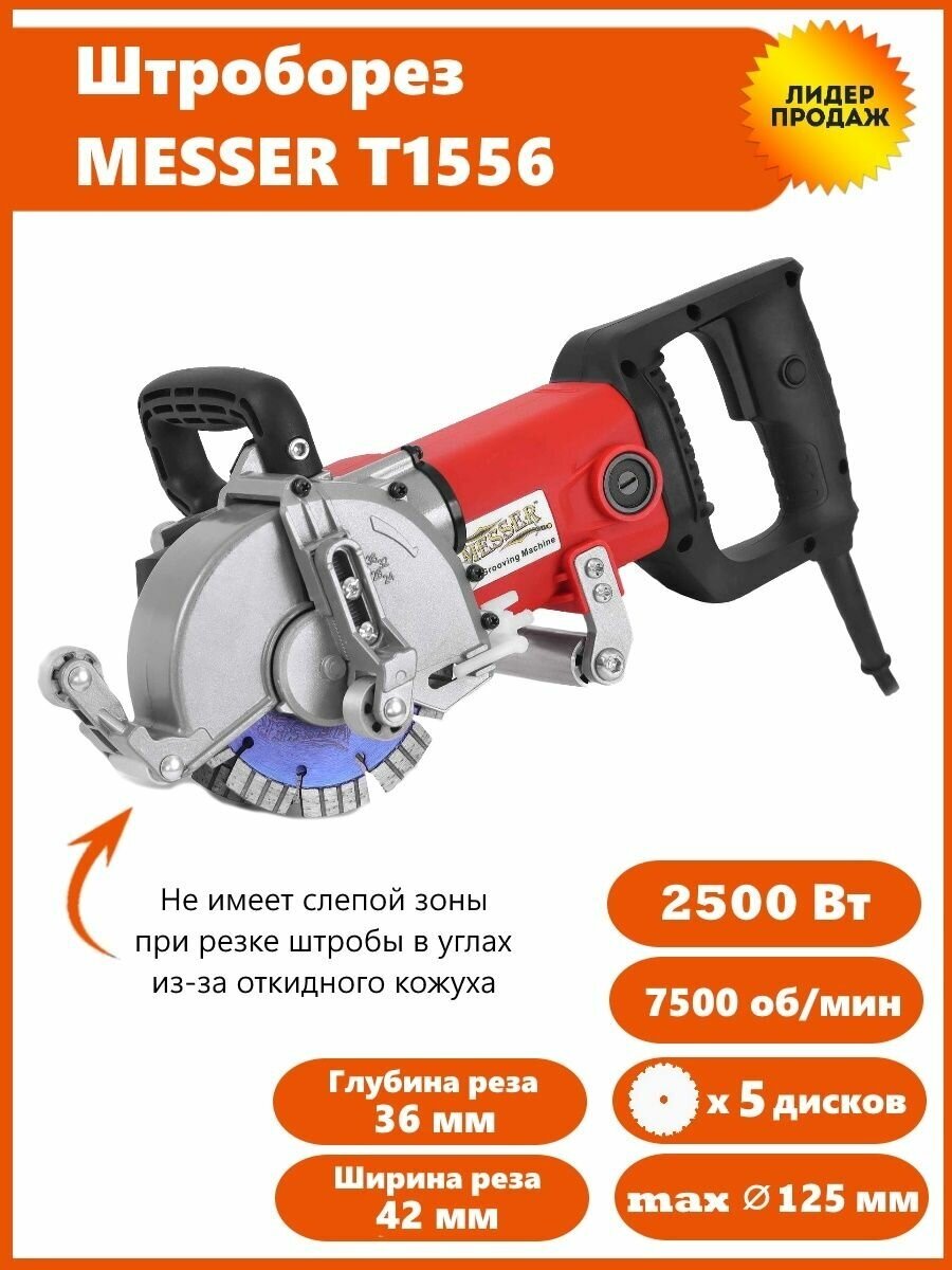 К особенностям штробореза MESSER T1556 можно отнести то, что он не имеет "слепой" зоны при резке штробы в углах помещения. Это достигается благодаря конструктивной особенности защитного кожуха. Когда штроборез упирается в перпендикулярную стену, кожух открывается и позволяет продолжить резку штробы глубже в угол.