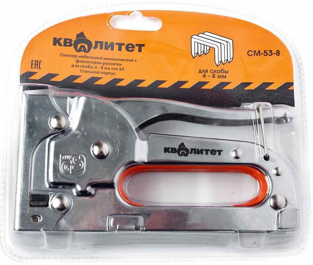 Степлер металлический с двухкомпонентной рукояткой, тип используемой скобы 53, размер скоб 4-8 мм.