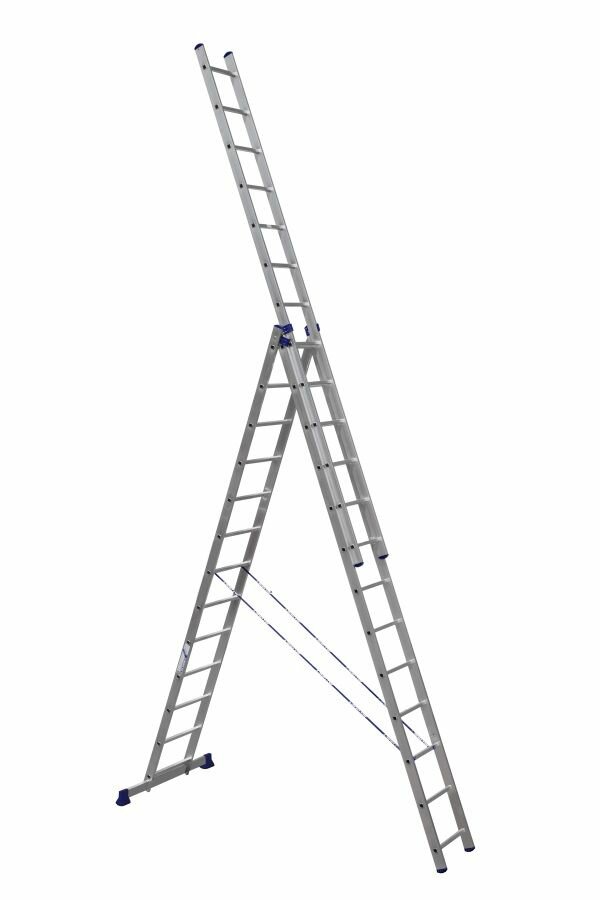 Лестница 3 секции Alumet 5313 — безопасное решение для дома и дачи: выдерживает до 150 кг, рабочая высота до 9,6 м, алюминий, складная конструкция.