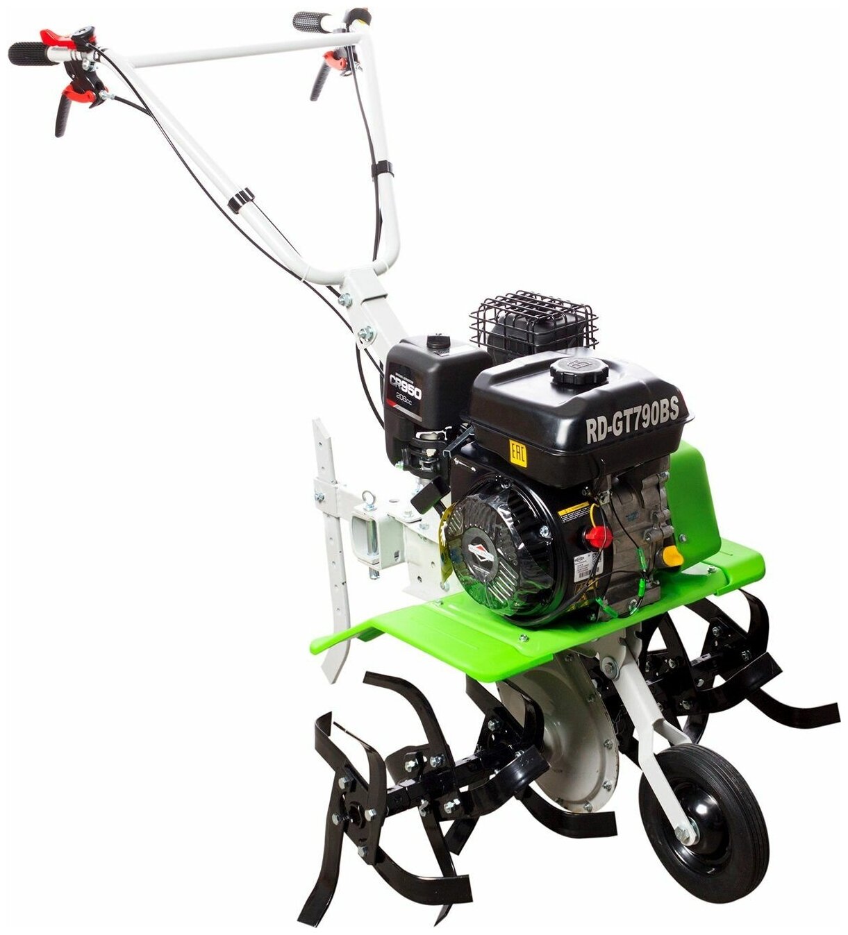 Мотокультиватор REDVERG RD-GT790BS надёжный и производительный агрегат с четырёхтактным двигателем Briggs&Stratton RS 950, мощность которого составляет 6,5 л.с. или 4850 Вт. Объём двигателя 208 кубических сантиметров. Сцепление ременное. Ёмкость масляного бака 0,6 литра. Ёмкость топливного бака 3,1 литра, что позволяет поддерживать продолжительный рабочий цикл. Фрезы кованные разборные. Диаметр фрезы 300 мм. Ширина культивации 790 мм. Глубина вспашки 330 мм. Большие колёса, передняя и задняя скорости обеспечивают манёвренность инструмента в процессе эксплуатации и транспортировки. Вес товара насчитывает 52 кг.