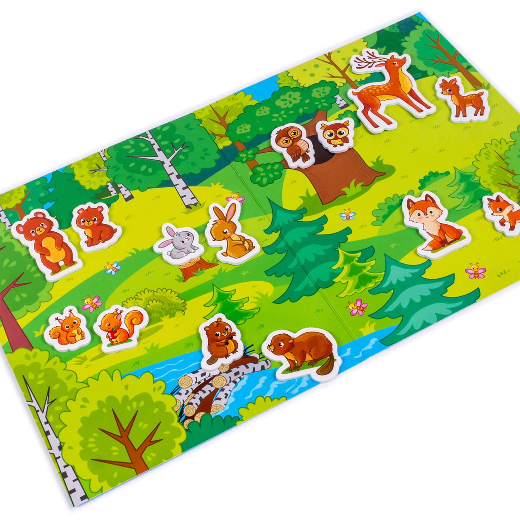 Развивающая игра с многоразовыми наклейками познакомит малыша с обитателями леса. Наклеивая и отклеивая наклейки, ребёнок запомнит, как выглядят взрослые животные и их детёныши, как они называются, где живут.