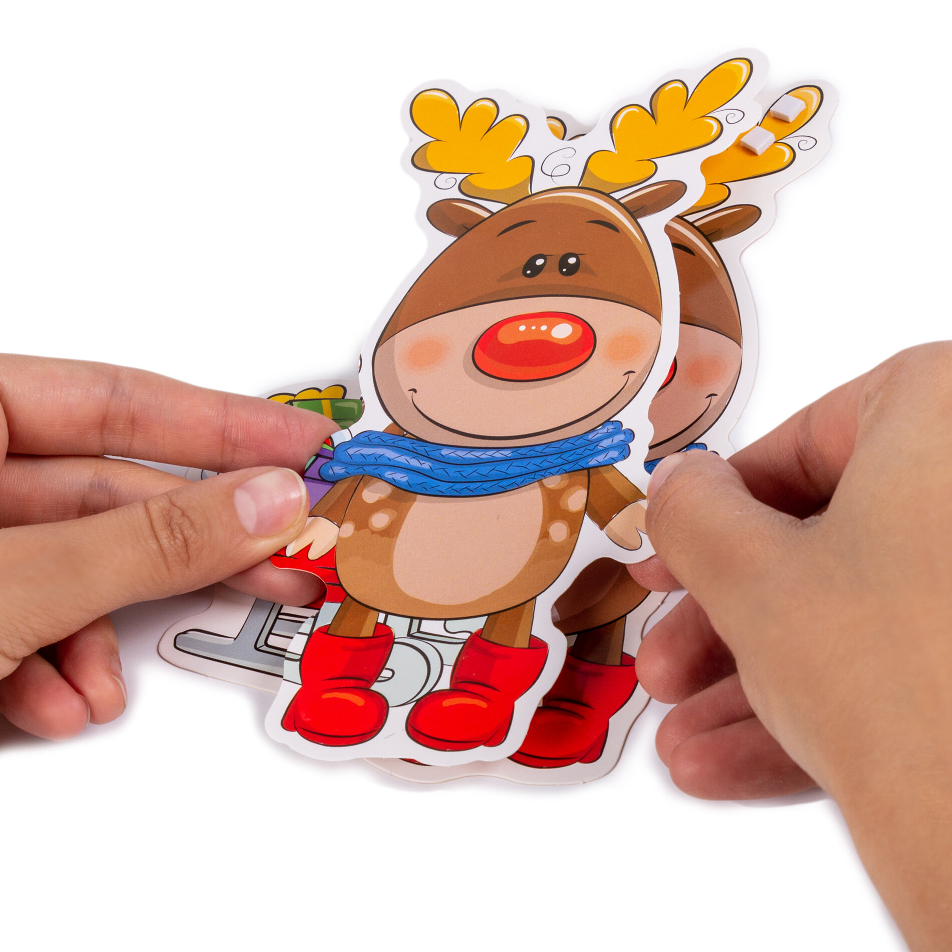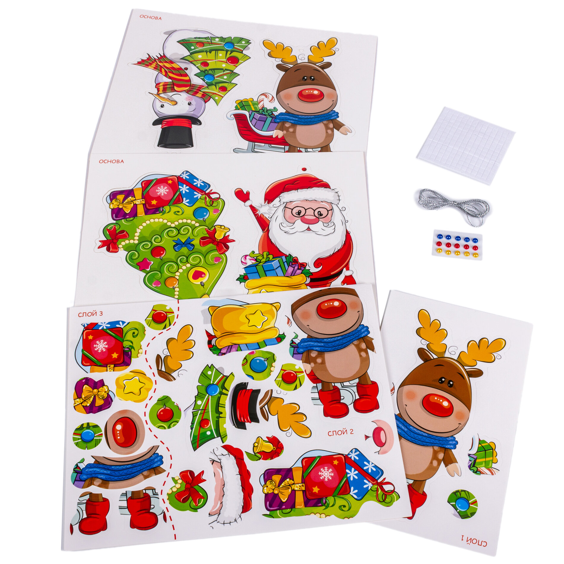 набор для изготовления 4х игрушек. смысл следующий: фрагменты наклеиваются слоями при помощи двустороннего скотча( в коплекте есть). картон плотный, формы первого слоя выполнены из более плотного картона.