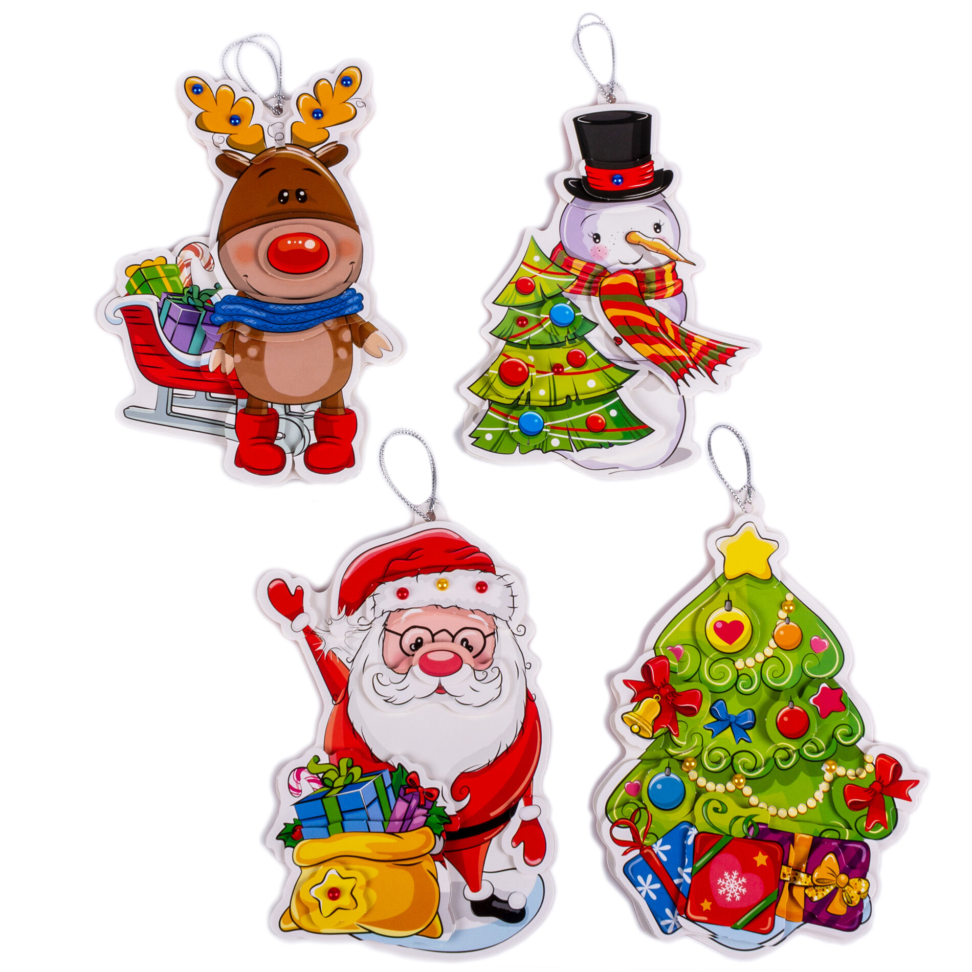 В наборе четыре 3D-игрушки, которые ребёнок легко сделает самостоятельно. Клей и ножницы не нужны - детали для приклеивания уже вырублены, достаточно аккуратно выдавить их из основы, и приклеить на игрушку объёмным двухсторонним скотчем. Детали наклеивают в несколько слоёв, что придаёт плоскому изображению эффект объёма. Новогодние 3D-игрушки - Дед Мороз, олень, нарядная ёлочка и весёлый снеговик - непременно подарят праздничное настроение вашему малышу!
