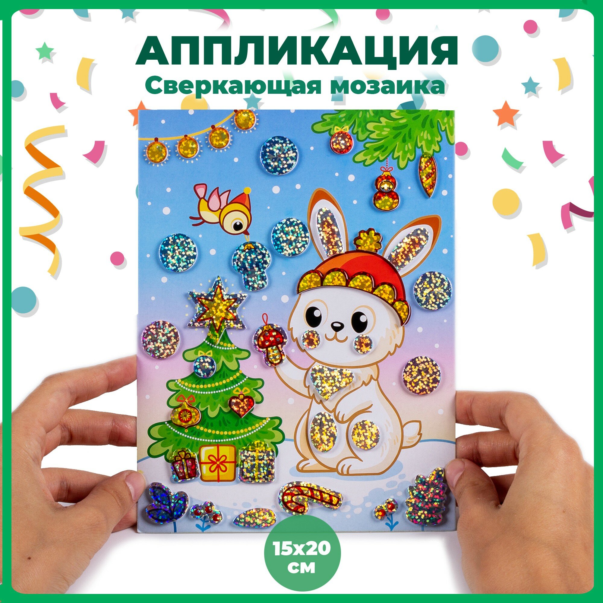 Яркая праздничная аппликация с символом наступающего года. В наборе вы найдёте всё, что нужно для работы, дополнительные материалы (например, клей и ножницы) не понадобятся. Красочные и яркие детали мозаики разных форм выполнены из мягкого пластика ЭВА и покрыты сверкающей голографической плёнкой. Неповторимое сияние и блеск придают изображению дополнительное очарование. Малыш легко справится с работой, ведь ему не нужны ни клей, ни ножницы: объёмные детали легко приклеятся на картонную основу. Чтобы сделать аппликацию, достаточно отклеить деталь от основы и приложить в нужное место на картинке. Готовая картинка станет прекрасным подарком для родных, украшением детской комнаты, тематической поделкой в детский сад. Игра развивает мелкую моторику рук, зрительное и сенсорное восприятие, внимание и глазомер.