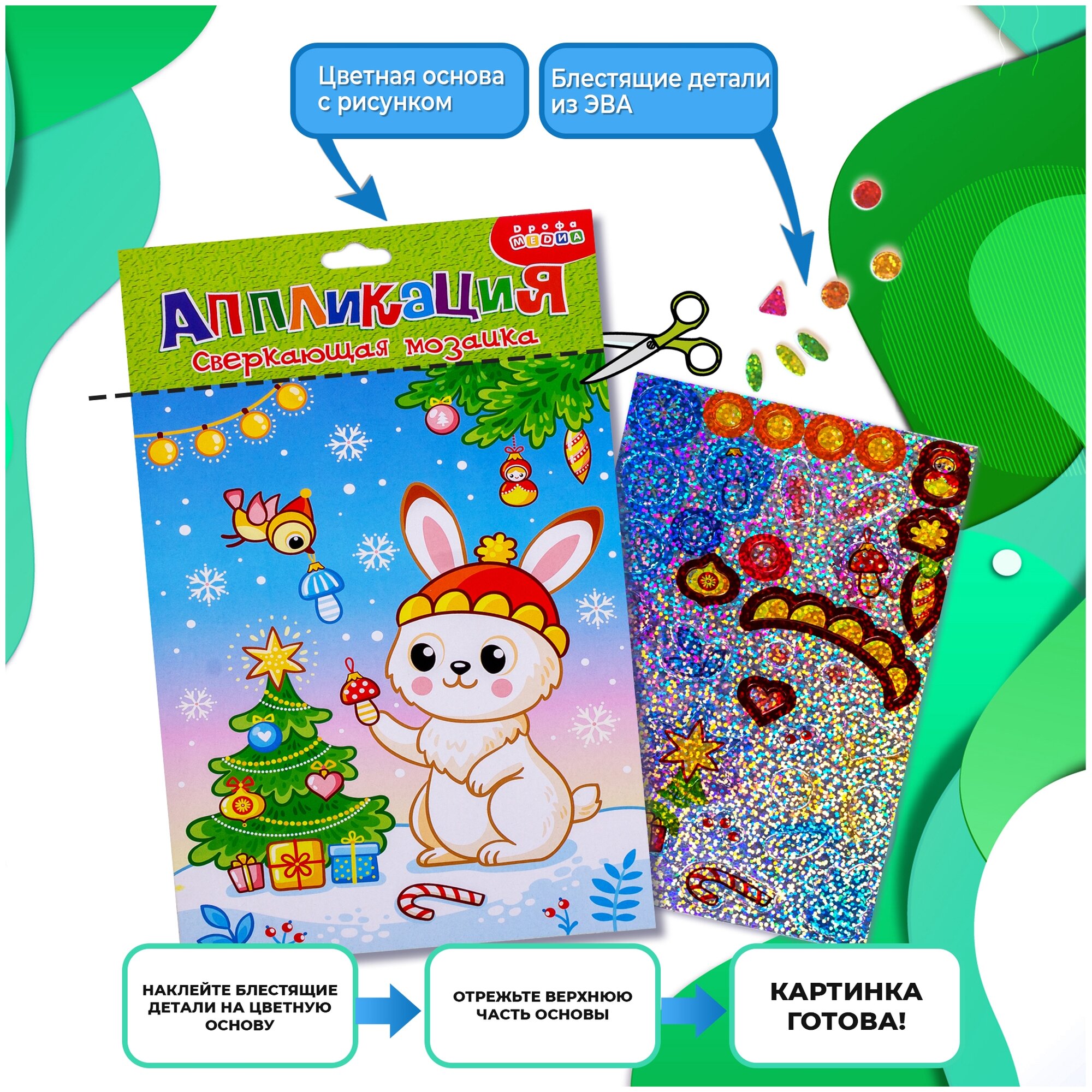 В комплекте: картонная основа, самоклеящиеся детали из мягкого пластика ЭВА с голографическим покрытием.