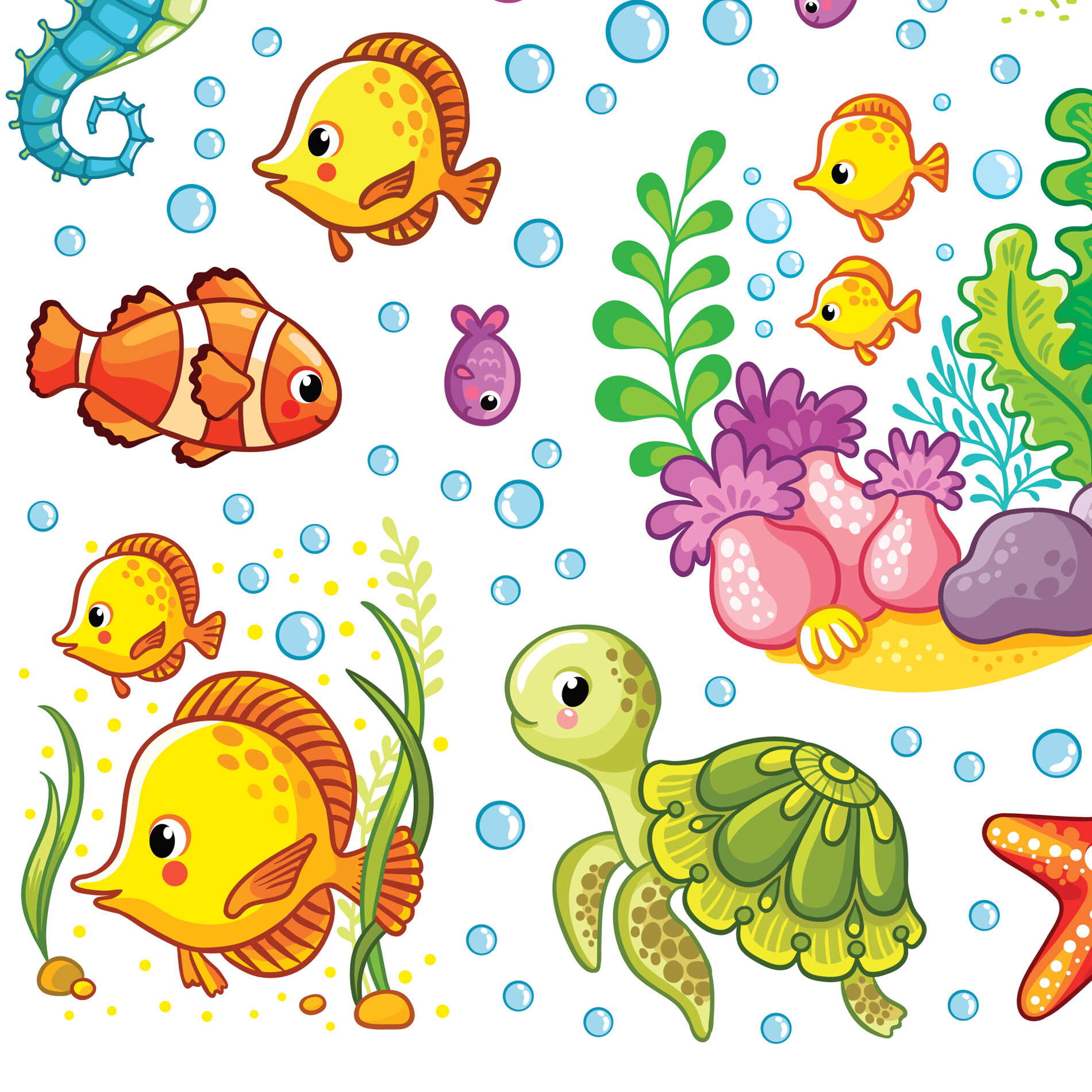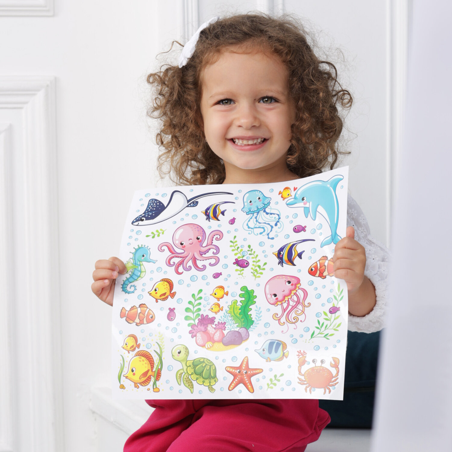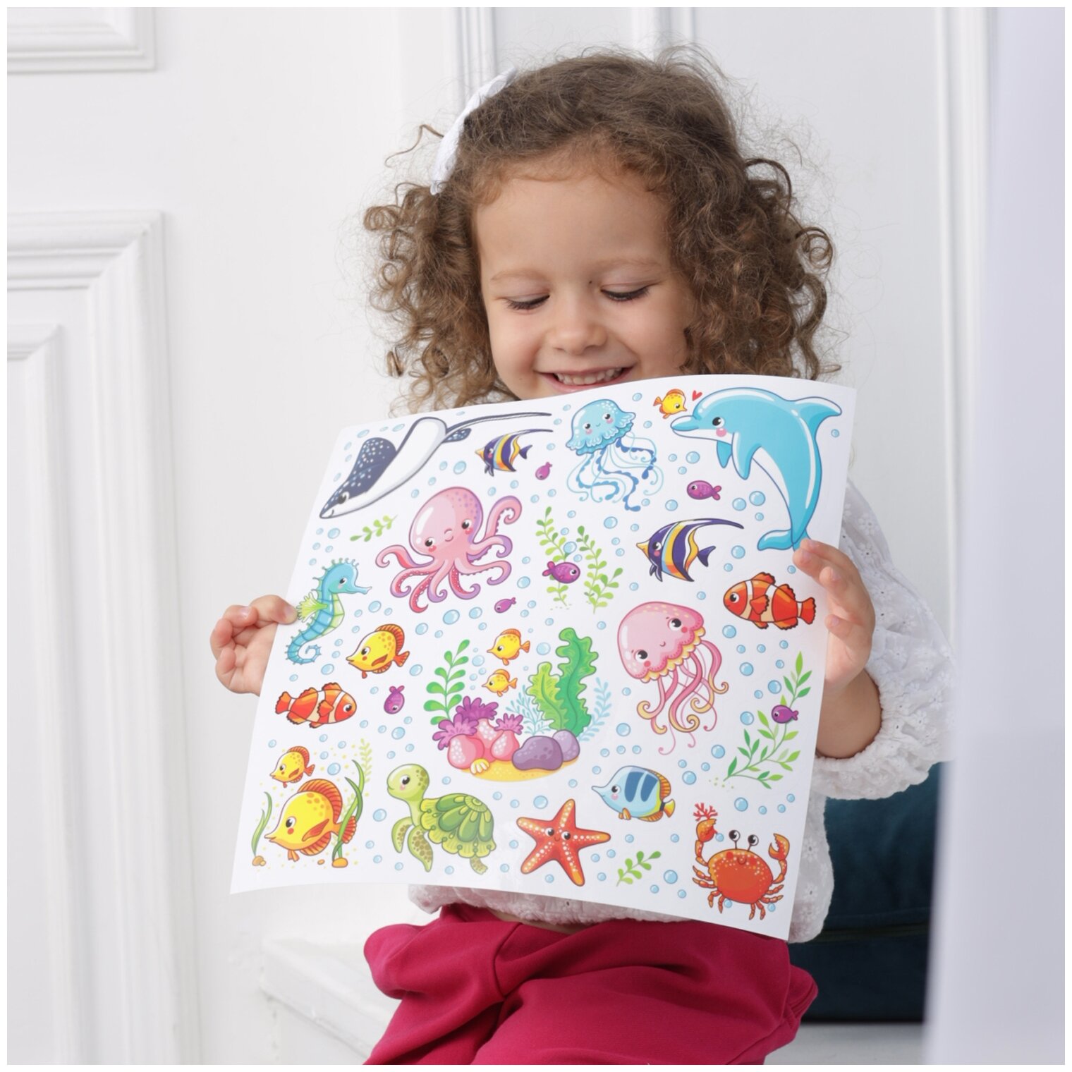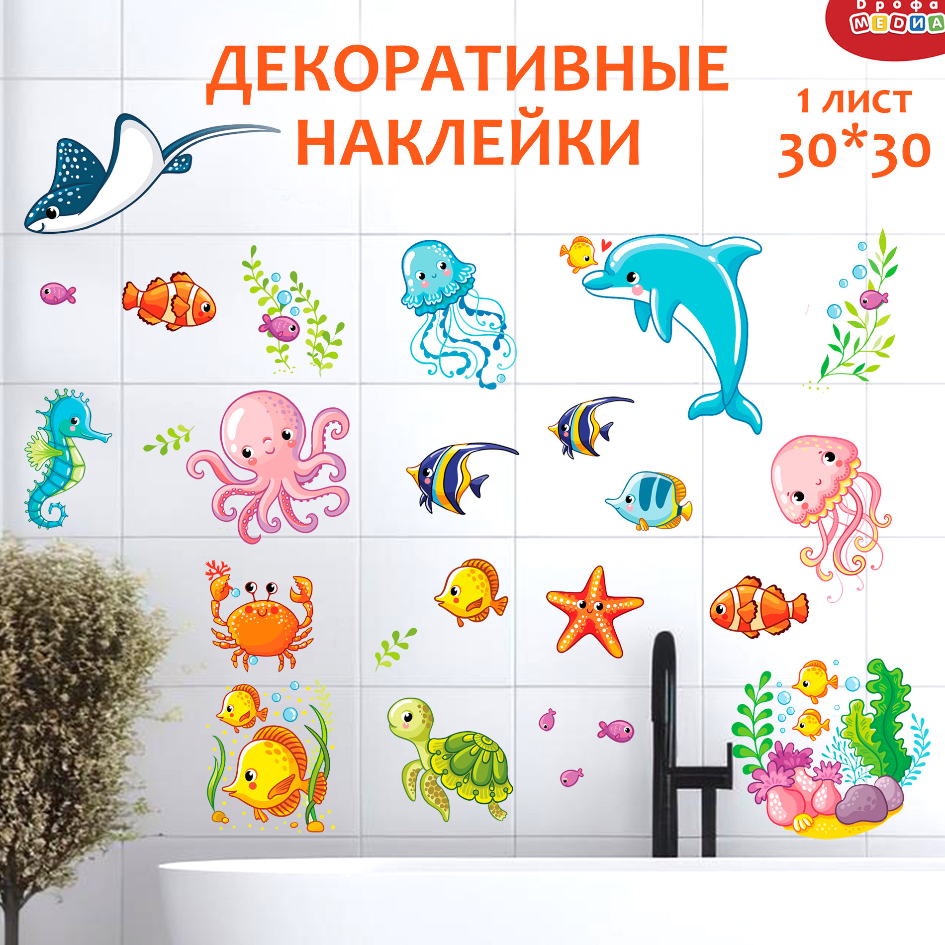 Детские наклейки для ванной комнаты - не боятся воды! Подходят для мальчиков и для девочек. Каждое изображение вырезано отдельно. Наклейки не оставляют следов, их можно переклеивать несколько раз. Яркий декоративный набор для ванны. 25 наклеек в наборе (1 лист с наклейками, размер листа - 30х30 см, листовка с инструкцией).