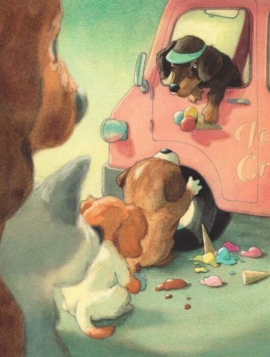 Мягкие акварельные иллюстрации Гребана прелестны. Они не подробные, в них больше акцента на главных героях и их будущей професии. Щенки в его исполнении милы и, кажется, всерьёз задумались о будущей профессии). -