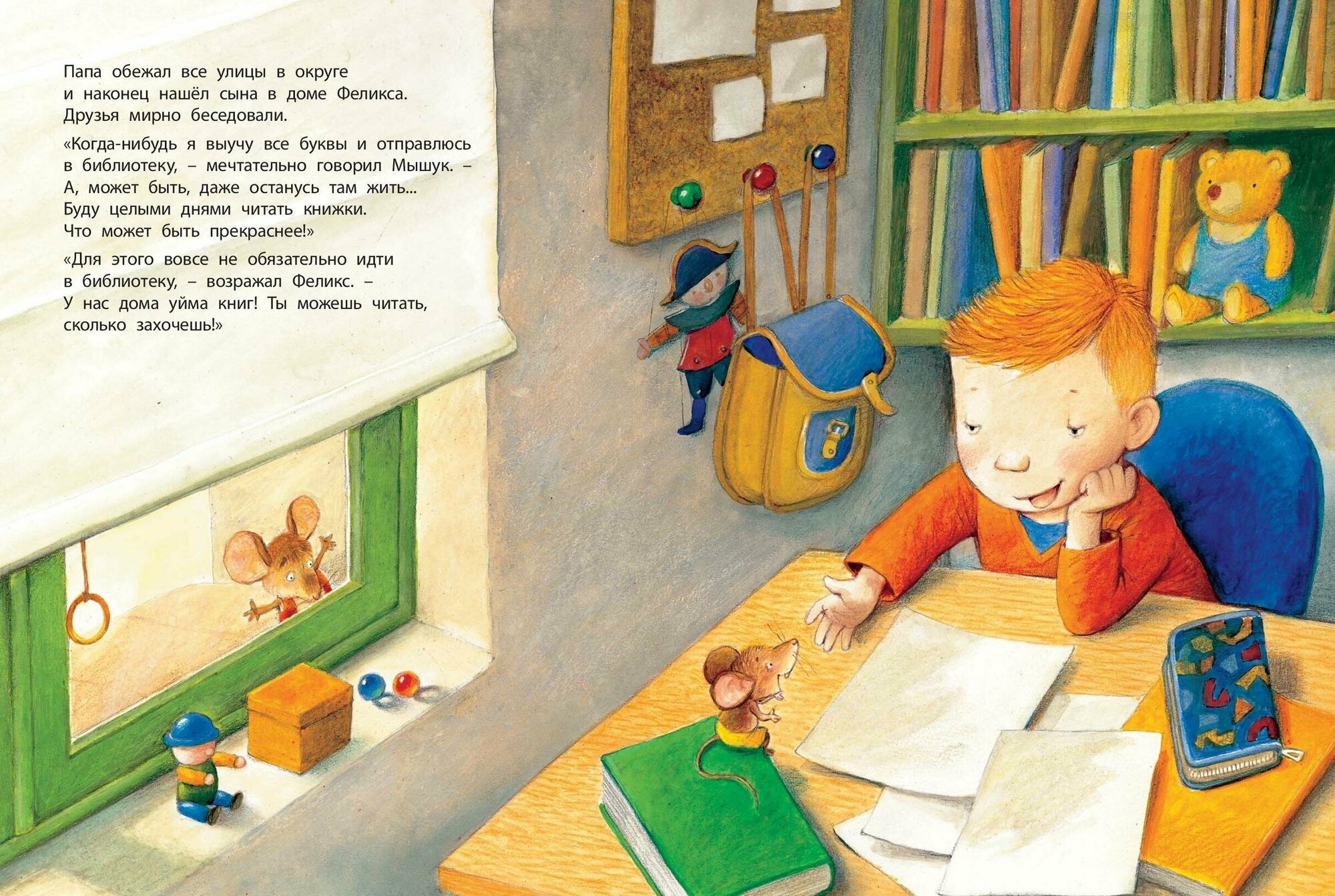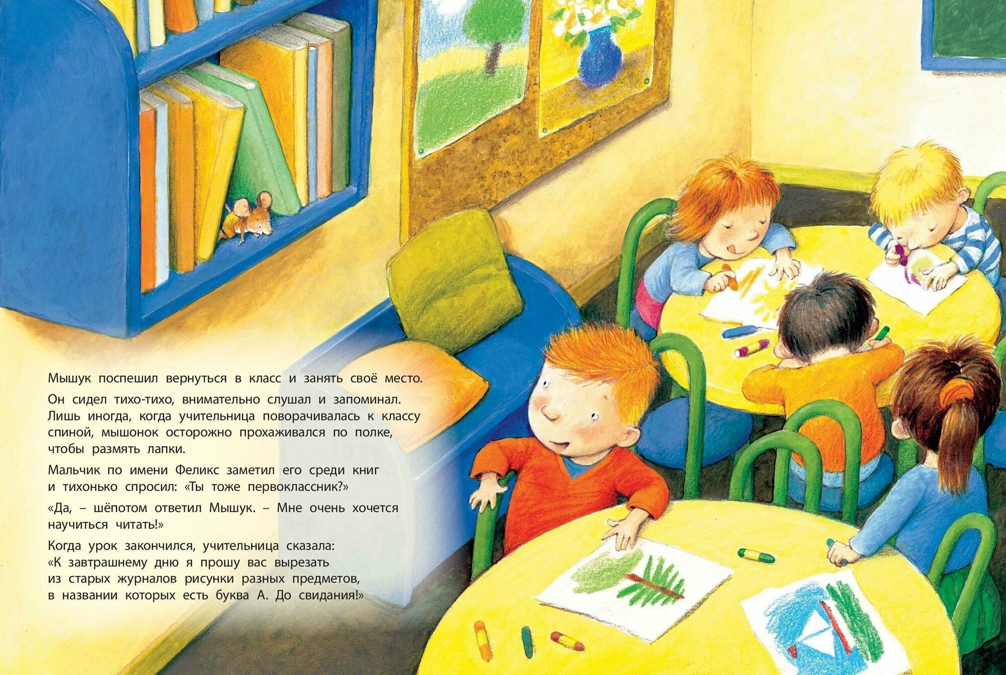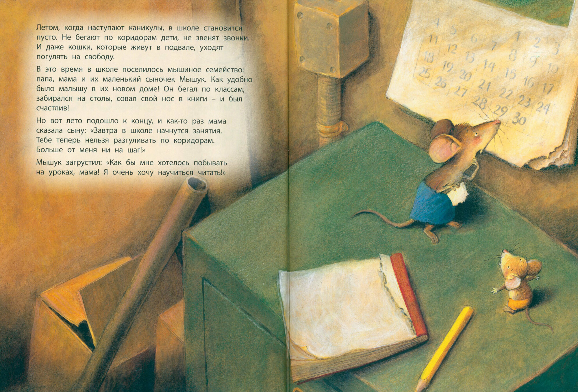 Трогательная и прекрасно иллюстрированная история о любви к знаниям. Во время каникул в опустевшей школе поселилась мышиная семья. А когда уроки возобновились, маленький мышонок тоже решил научиться читать. Он тайком пробирался в класс и вместе с первоклассниками старательно изучал буквы. Малыш решил когда-нибудь написать книгу. Тогда папа и мама мышонка тоже решили освоить грамоту…