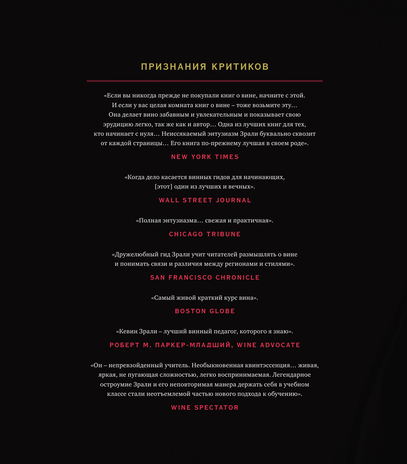 "Кевин Зрали - лучший винный педагог, которого я знаю". - Роберт М. Паркер младший, wine advocate