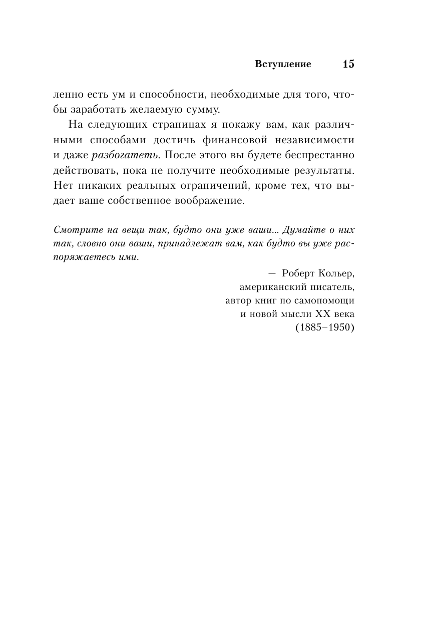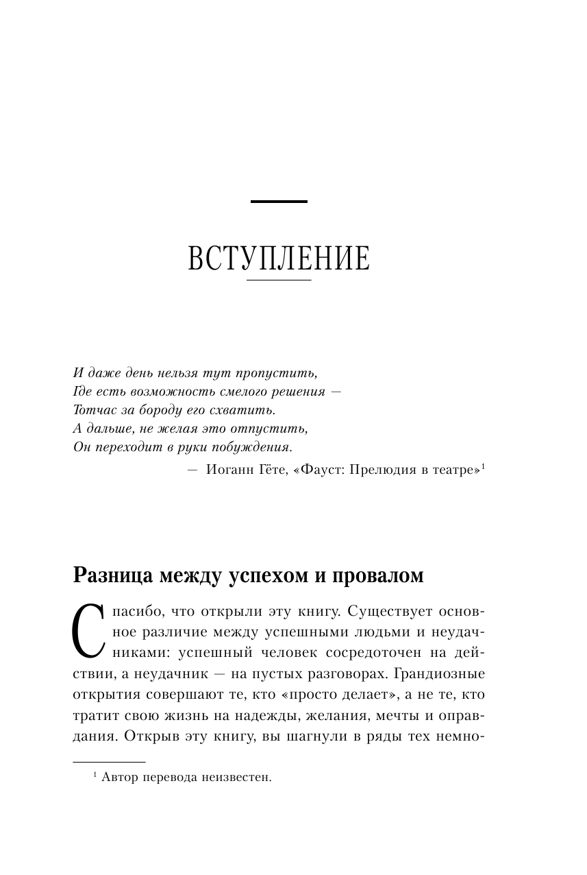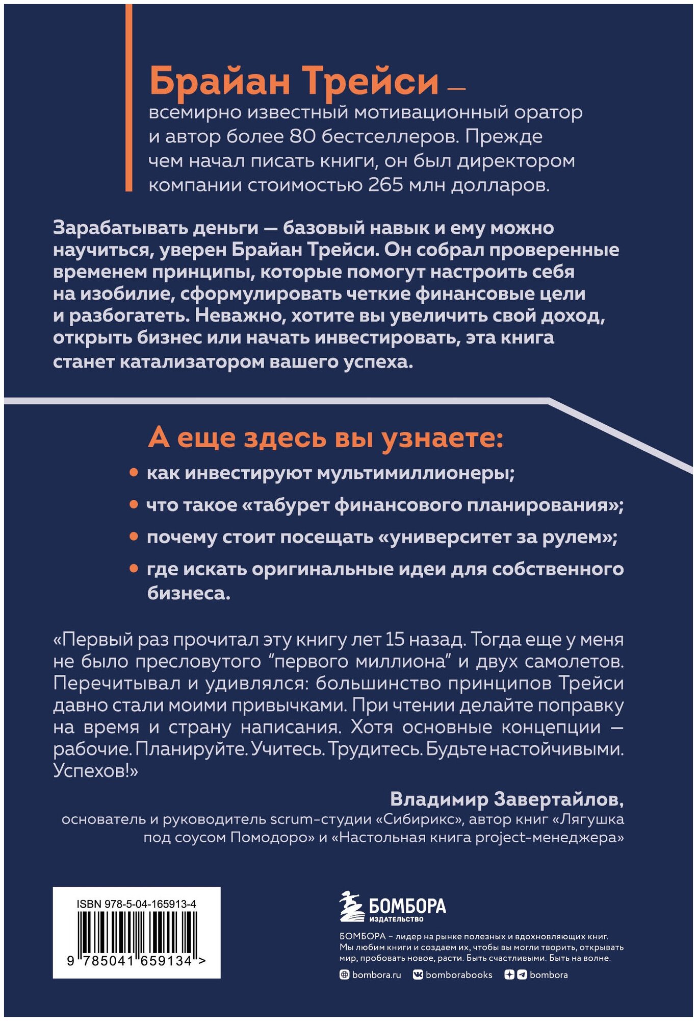 "Первый раз прочитал эту книгу лет 15 назад. Тогда еще у меня не было пресловутого "первого миллиона" и двух самолетов. Перечитывал и удивлялся: большинство принципов Трейси давно стали моими привычками. При чтении делайте поправку на время и страну написания. Хотя основные концепции - рабочие. Планируйте. Учитесь. Трудитесь. Будьте настойчивыми. Успехов!" - Владимир Завертайлов, основатель и руководитель scrum-студии "Сибирикс", автор книг "Лягушка под соусом Помодоро" и "Настольная книга project-менеджера"