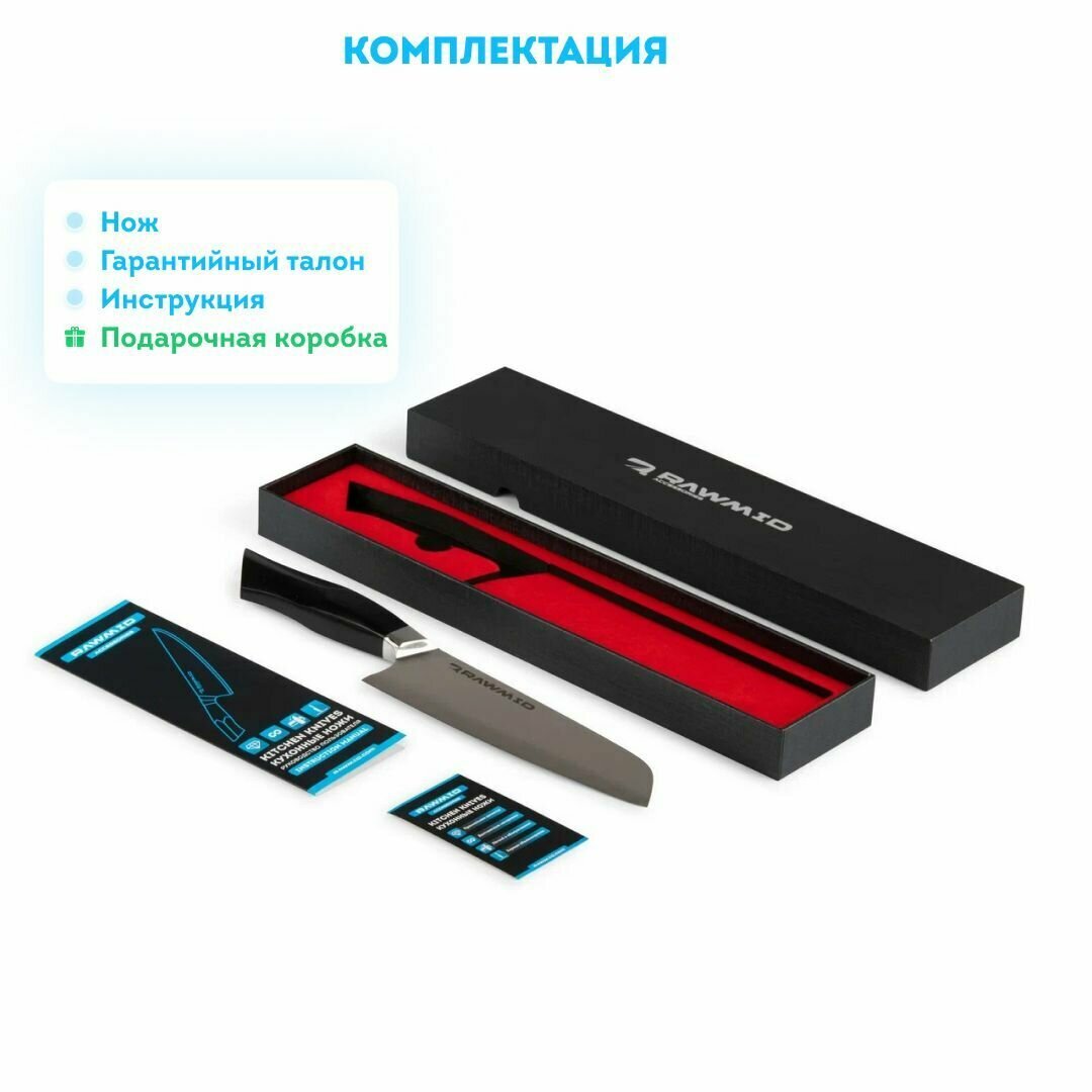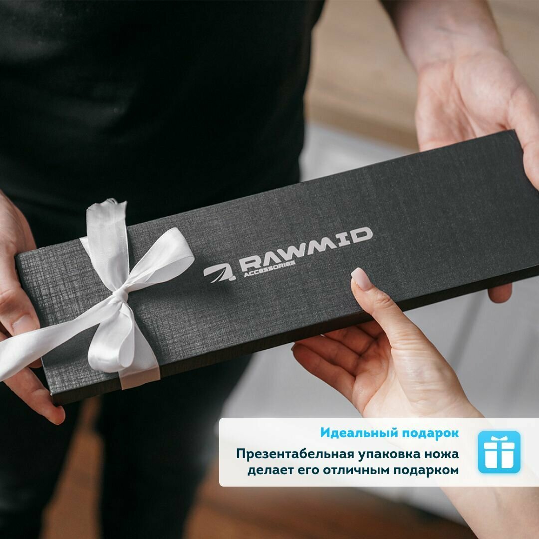 Нож Подарочная коробка Руководство Гарантийный талон ✓ Нож ✓ Подарочная коробка ✓ Руководство ✓ Гарантийный талон Дополнительные аксессуары Магнитная подставка RAWMID Выполнена из древесины акации, которая имеет высокую прочность и биоустойчивость. На подставку помещаются 4-5 широких ножей. Идеально сочетается с кухонными ножами RAWMID. Встроенный магнит крепко удерживает даже крупные ножи, обеспечивая комфортные и безопасные условия хранения.Купить Кухонные ножницы RAWMID Изготовлены из прочной нержавеющей стали. Позволяют с лёгкостью резать пучки зелени, отрезать ветки, резать пиццу, разделывать мясо и рыбу, вскрывать грецкие орехи, открывать стеклянные бутылки.