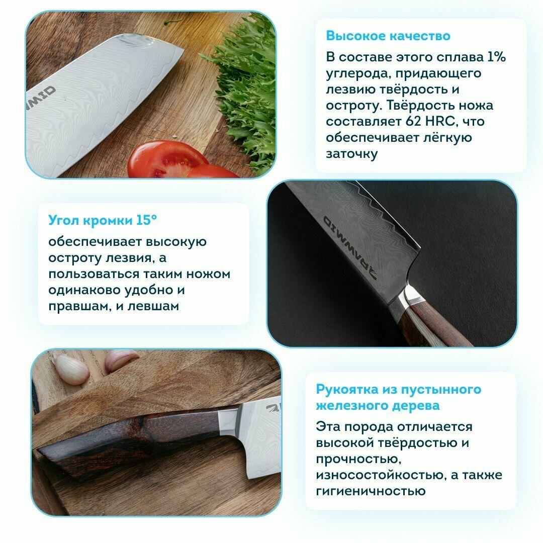 Относительно небольшого размера, им можно делать абсолютно всё: резать, шинковать, чистить и рубить любые продукты, хотя некоторые виды нарезок удобнее делать специализированными инструментами. Длина лезвия 13 см.