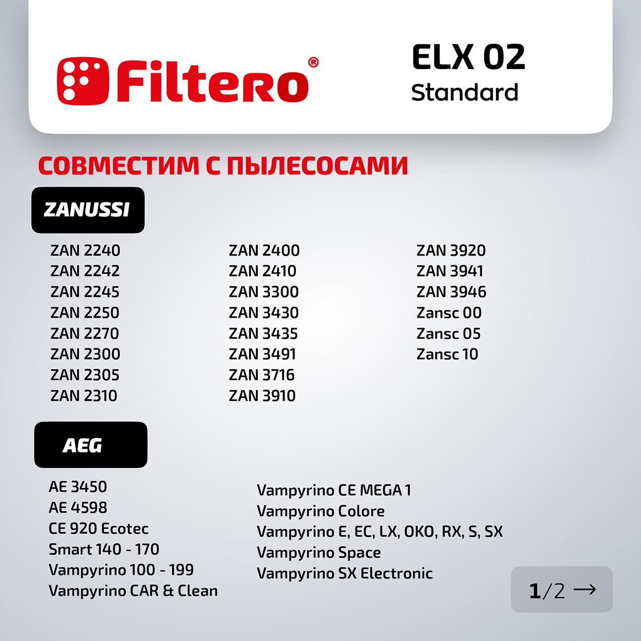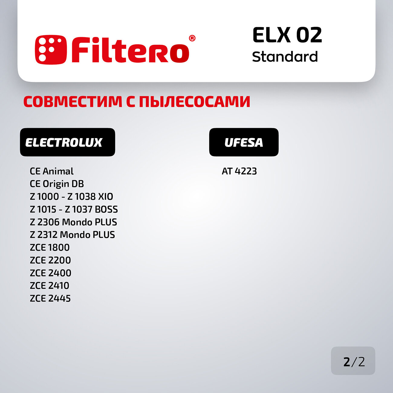 Бумажные пылесборники рассчитаны на установку в пылесосы AEG, Electrolux, Thomas, Ufesa, Zanussi. Мешки-пылесборники производятся на оборудовании, которое отвечает нормам стандартов отрасли. Набора, состоящего из 5 Filtero ELX 02 Standard, хватит на несколько месяцев использования.