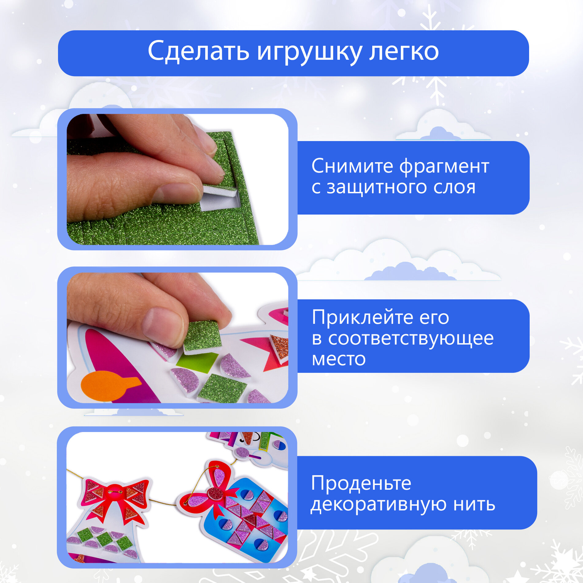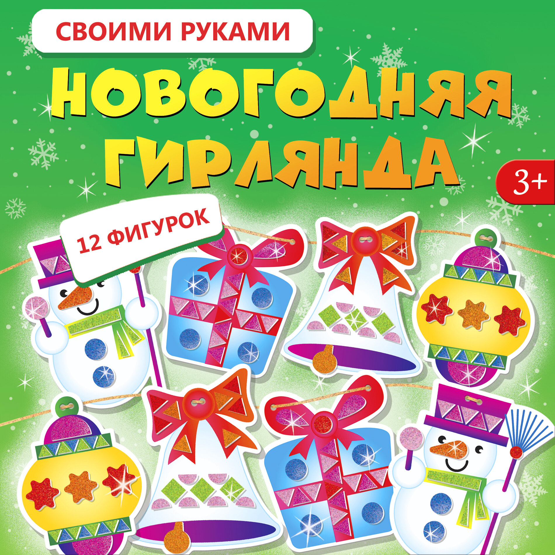 В наборе есть всё, что нужно для создания гирлянды: 12 фигурок из картона, блестящие самоклеящиеся детали для украшения и декоративная нить для нанизывания фигурок.