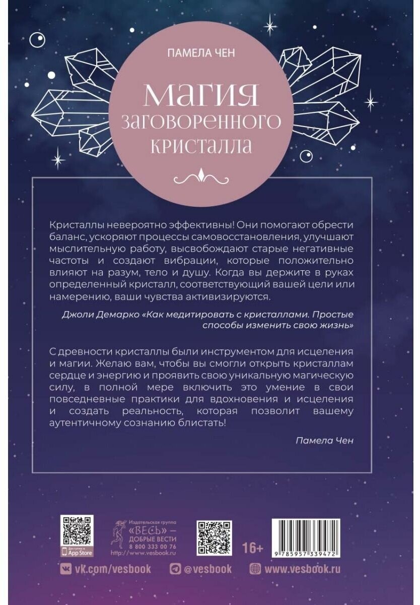 Заговоры - это средство для воплощения желаний, манифестации намерения. Кристаллы же издавна известны своей способностью воспринимать, хранить и направлять различные энергии, в том числе энергию намерения. Если вы чувствуете, что вашим духовным практикам чего-то не хватает, возможно, стоит добавить к ним нечто материальное, и кристаллы подойдут для этого как нельзя лучше. Благодаря информации, представленной в книге Памелы Чен, вы испытаете магическую силу камней и сможете использовать их мудрость, чтобы достичь своих целей и прожить самую блестящую жизнь.